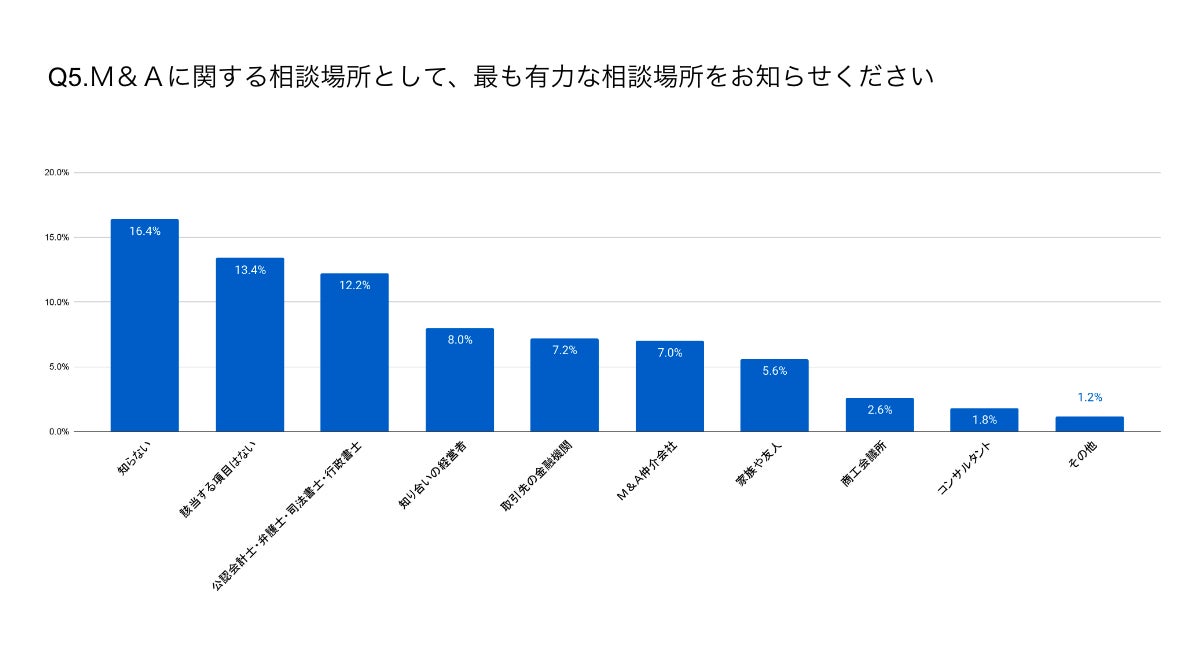 - M&Aの相談場所の回答として、「知らない」と回答した経営者が16.4%と最も多い回答に