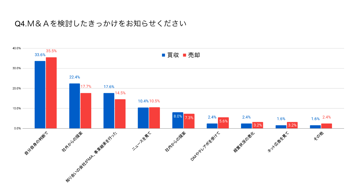 「自分自身の判断で」・「社外からの提案」・「知り合いの会社がM&A、事業継承を行なった」が、M&Aを検討するきっかけの上位3つになりました。