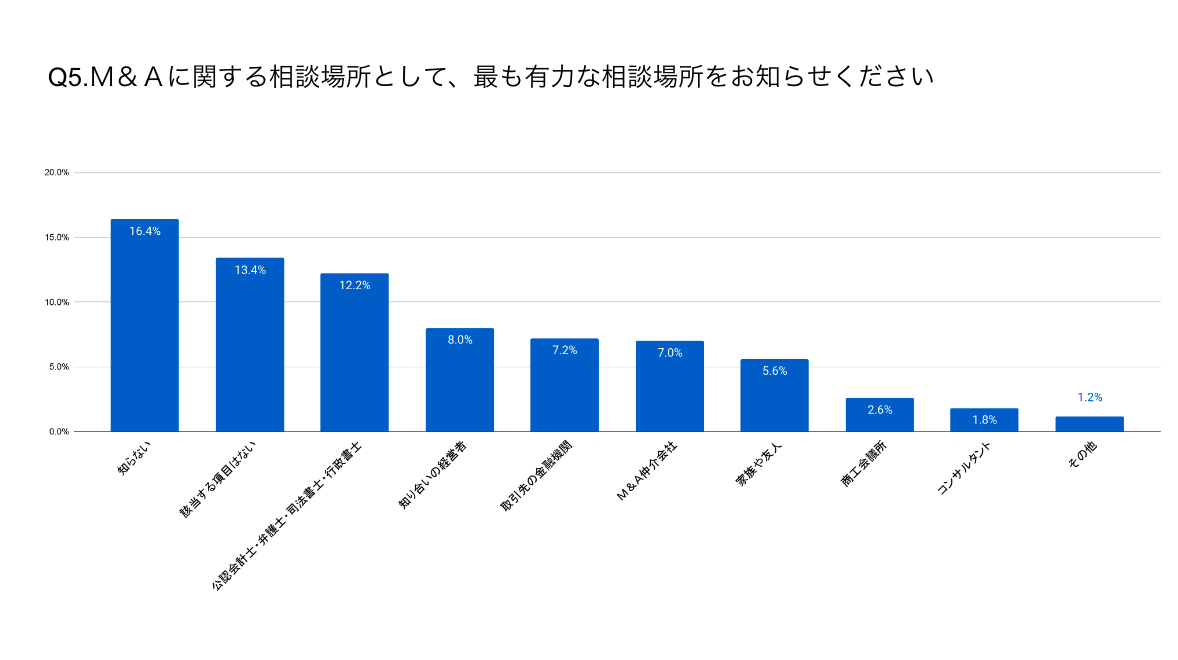- M&Aの相談場所の回答として、「知らない」と回答した経営者が16.4%と最も多い回答に