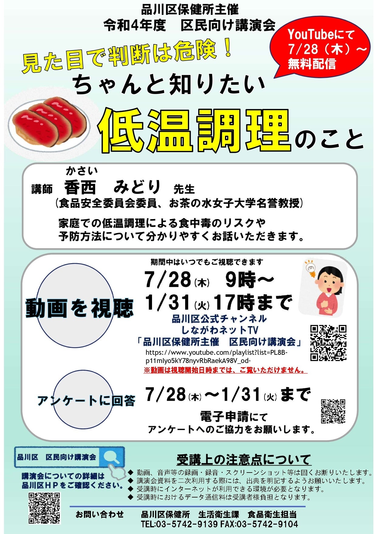 こうした現状を受け、家庭における食肉の低温調理による食中毒リスクや予防方法について、食品安全委員会委員の香西みどり先生をお招きし、品川区公式YouTubeチャンネル「しながわネットTV」で講演会をオンライン配信します。