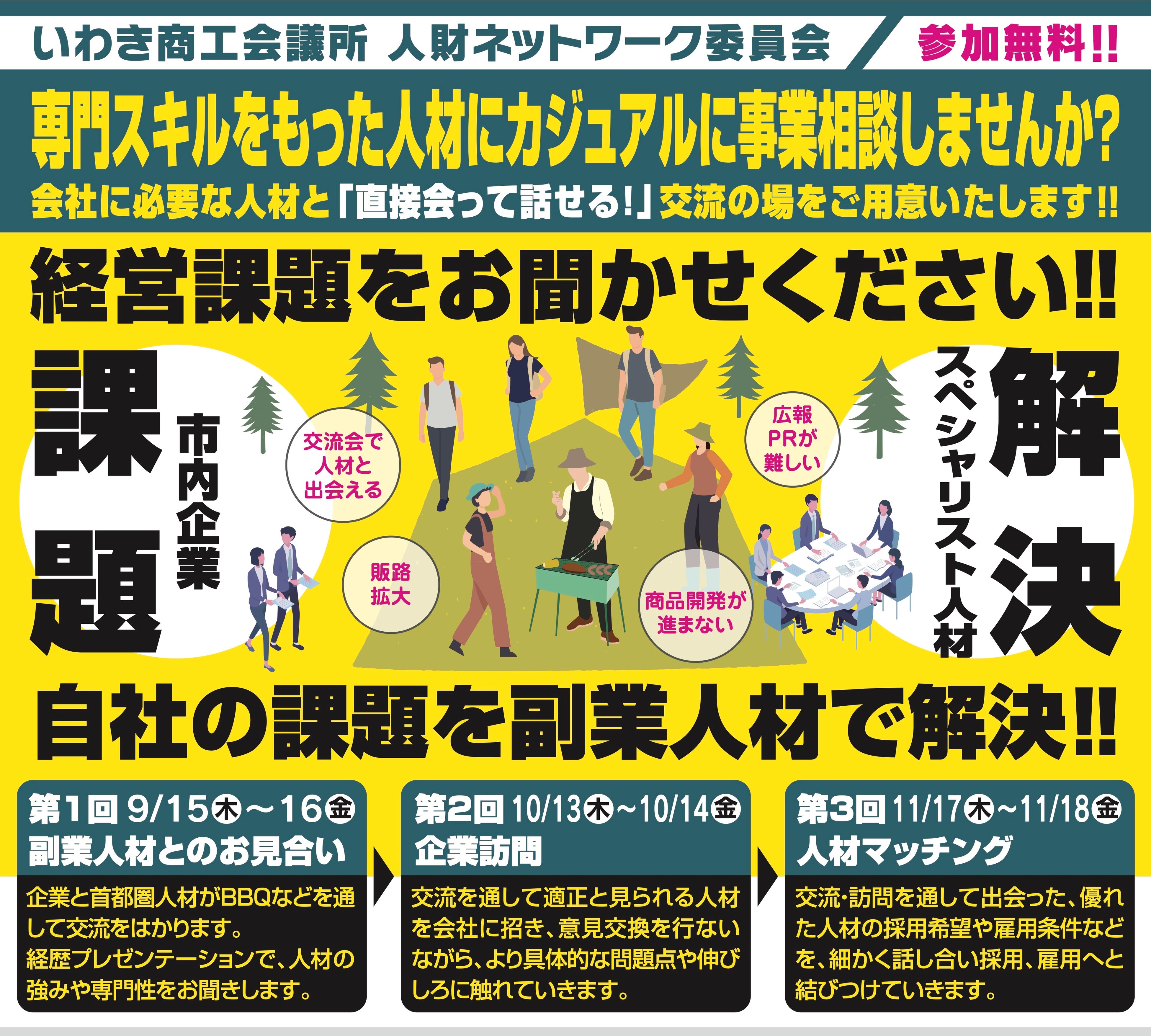 昨今の目紛しい市場の変化に対して、経営の多角化や業種転換などあらゆる事業課題を抱えるいわき市の事業者と、それらの課題を解決できる知見を持った首都圏のスペシャリスト人材を集め、いわき市にて1泊2日の事業課題付きワーケーションを3回に渡り実施します。