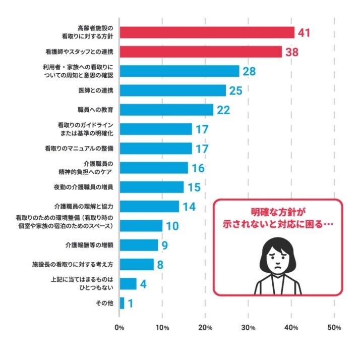 経験者・未経験者問わず、職員が最も重視しているのは「高齢者施設の看取りに対する方針」で41%の方が不安に感じています。