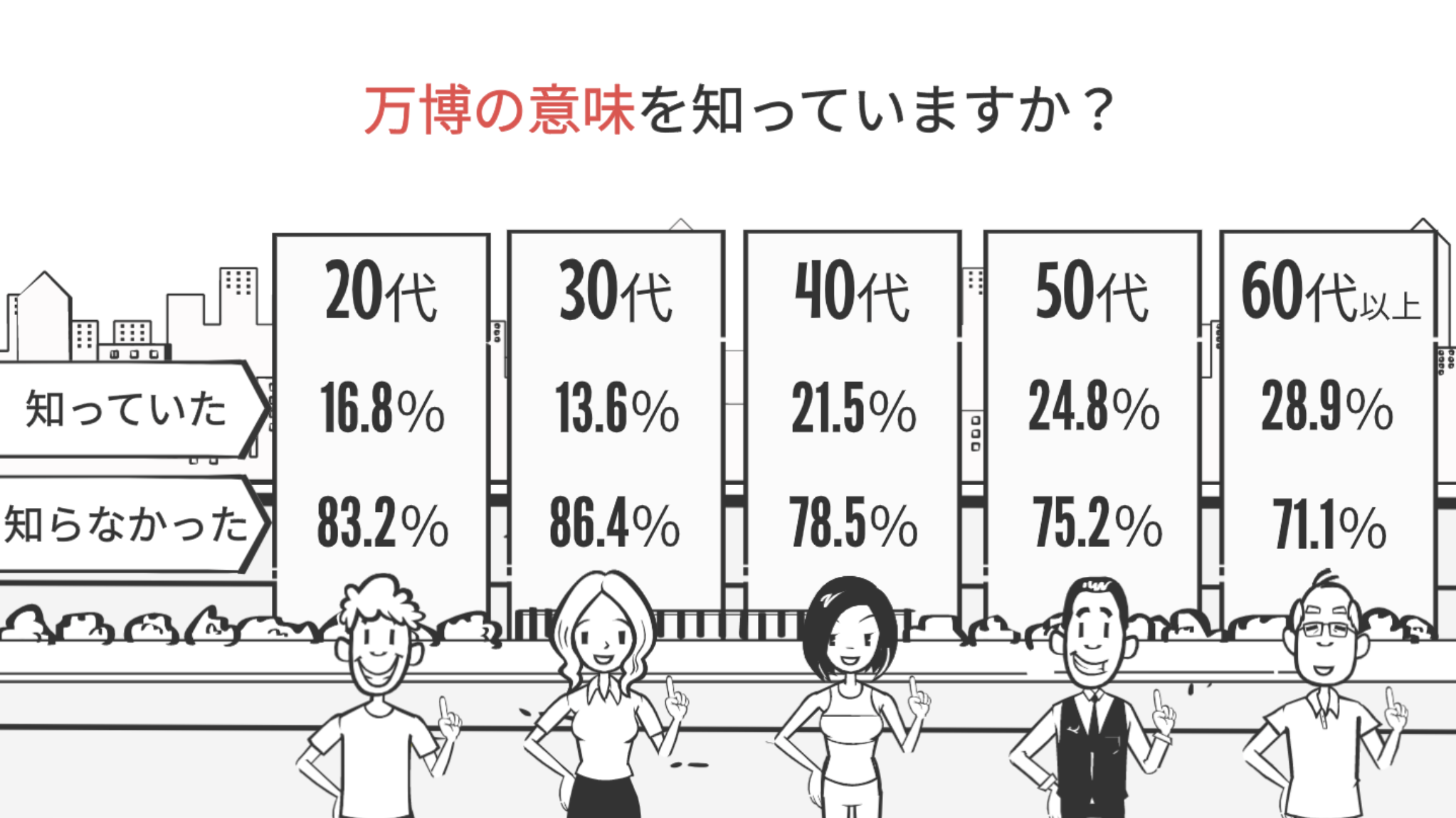 その結果、年代が上がるごとに万博の定義を知っている割合は高くなるものの、全体として8割弱が定義を知らないという結果となりました。