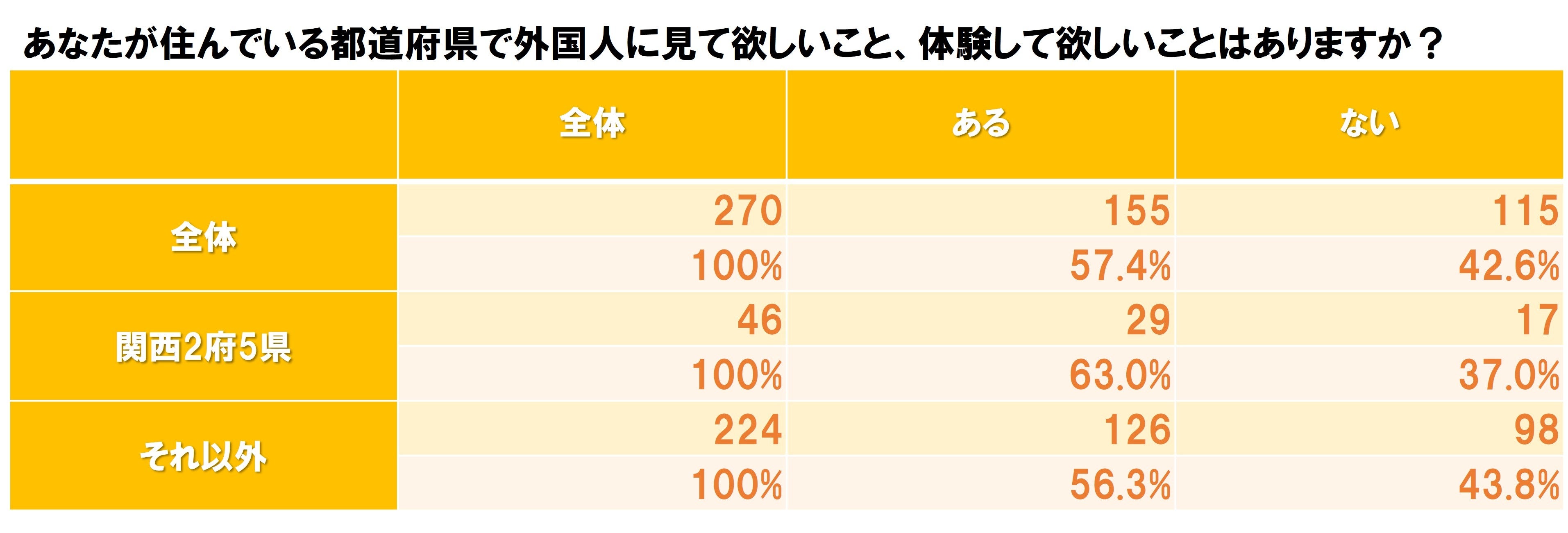 前問で外国人観光客が自身の居住する自治体に“来てほしい”とした270人に対し、「居住する自治体で外国人観光客に見てほしいこと、体験してほしいことがあるか?」に対して、57.4%の155人が“ある”と回答し、関西2府5県では60%を超えるなど、訪日外国人観光客への意識が高くなっていると考えられます。