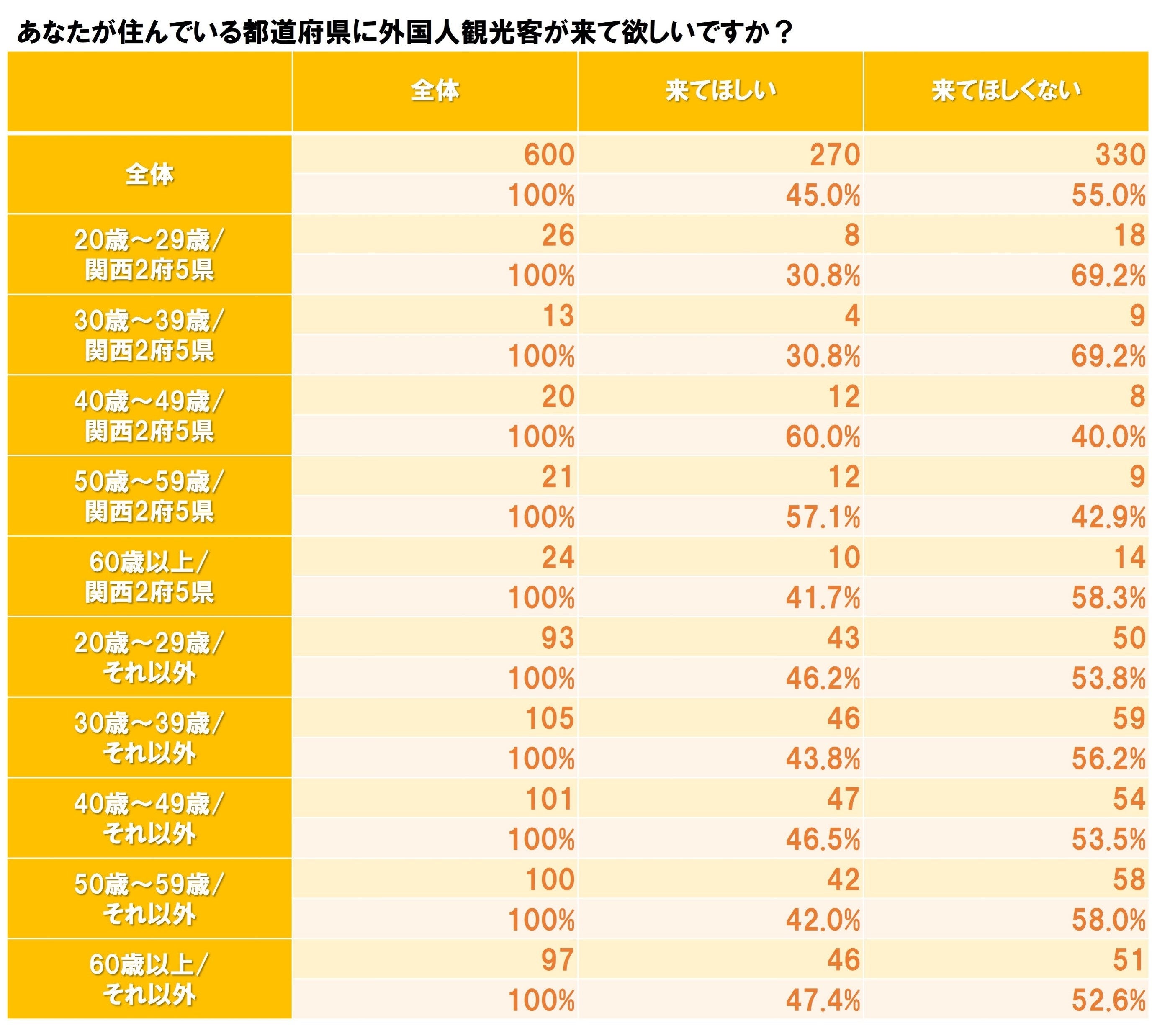 先ず大阪万博を開催するにあたり、外国人観光客が自身の居住する自治体に“来てほしい”とした人の割合は、全体としては45%となりました。現在がコロナ禍ということも関係していると思われますが、過半数を超えない結果となっています。ただ居住地が関西2府5県と比べて“それ以外”の人は各年代においても4割台なのに対し、“関西2府5県”に居住する40代、50代は50%を超えるなど、訪日外国人の誘致に積極的な様子が見て取れます。