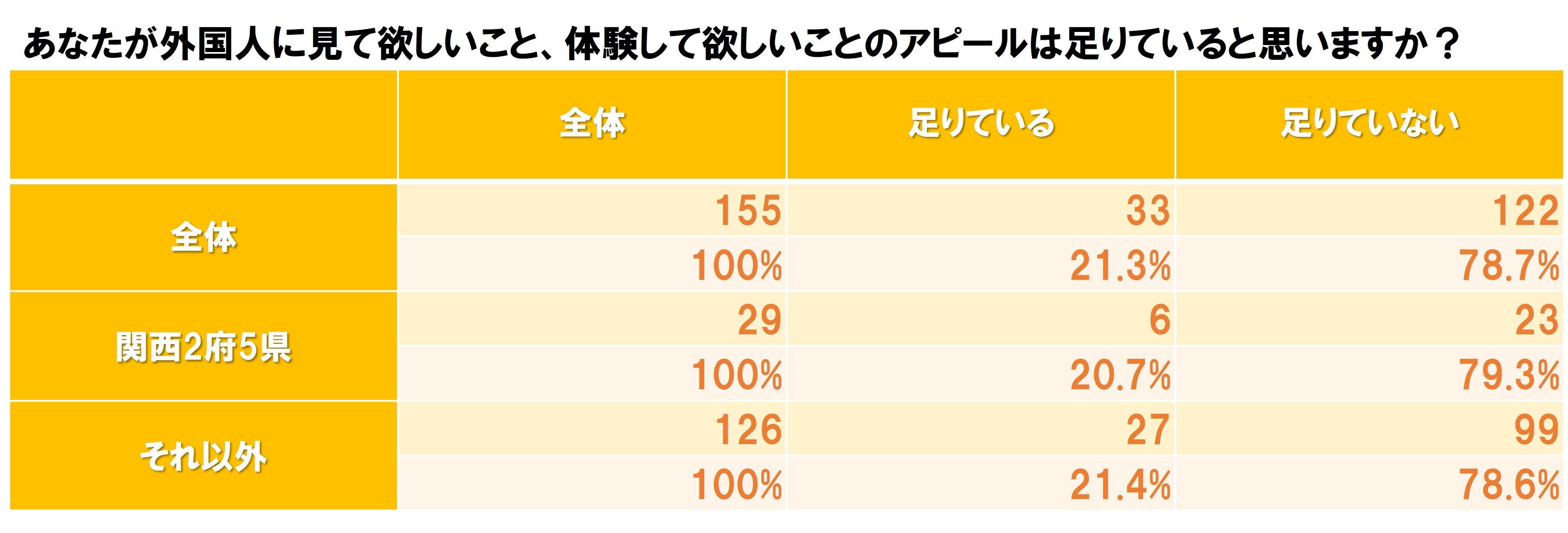 またその155人に対して、「外国人へのアピールは足りているか?」の質問をしたところ、“足りない”としてのが122人の78.7%となり、これは居住地が“関西2府5県”と“それ以外”の双方においても80%弱となるなど、差は認められない結果となっています。
