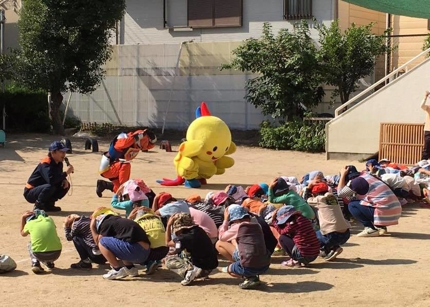 兵庫県のマスコットキャラクター「はばタン「と「未来特救ゴッドイーグル」保育園児のシェイクアウト訓練