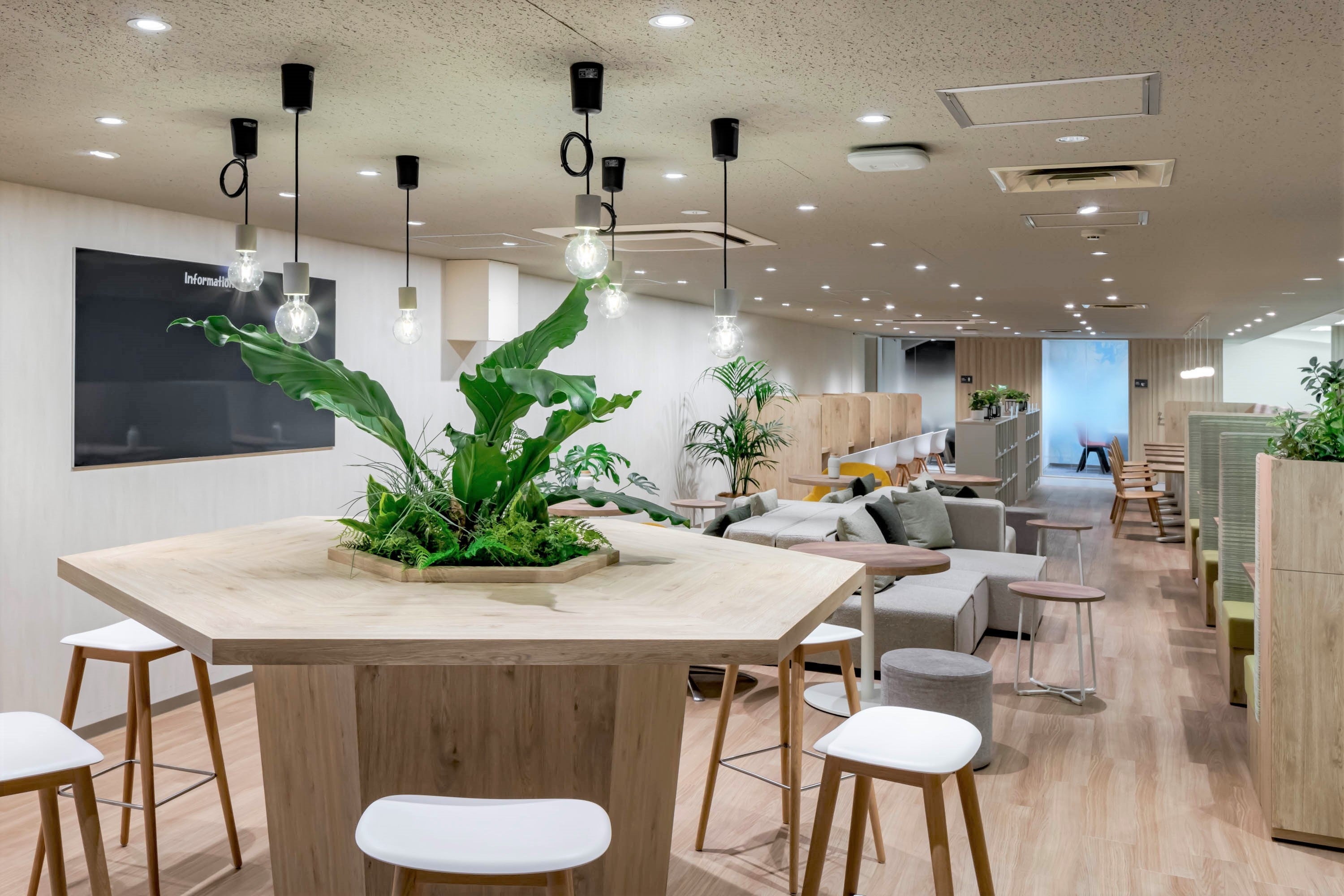 主に昼食時にしか利用されていなかったスペースを、業務やリフレッシュ、社員同士の交流など一日を通して様々な目的で使えるカフェエリアとしてリニューアルしました。