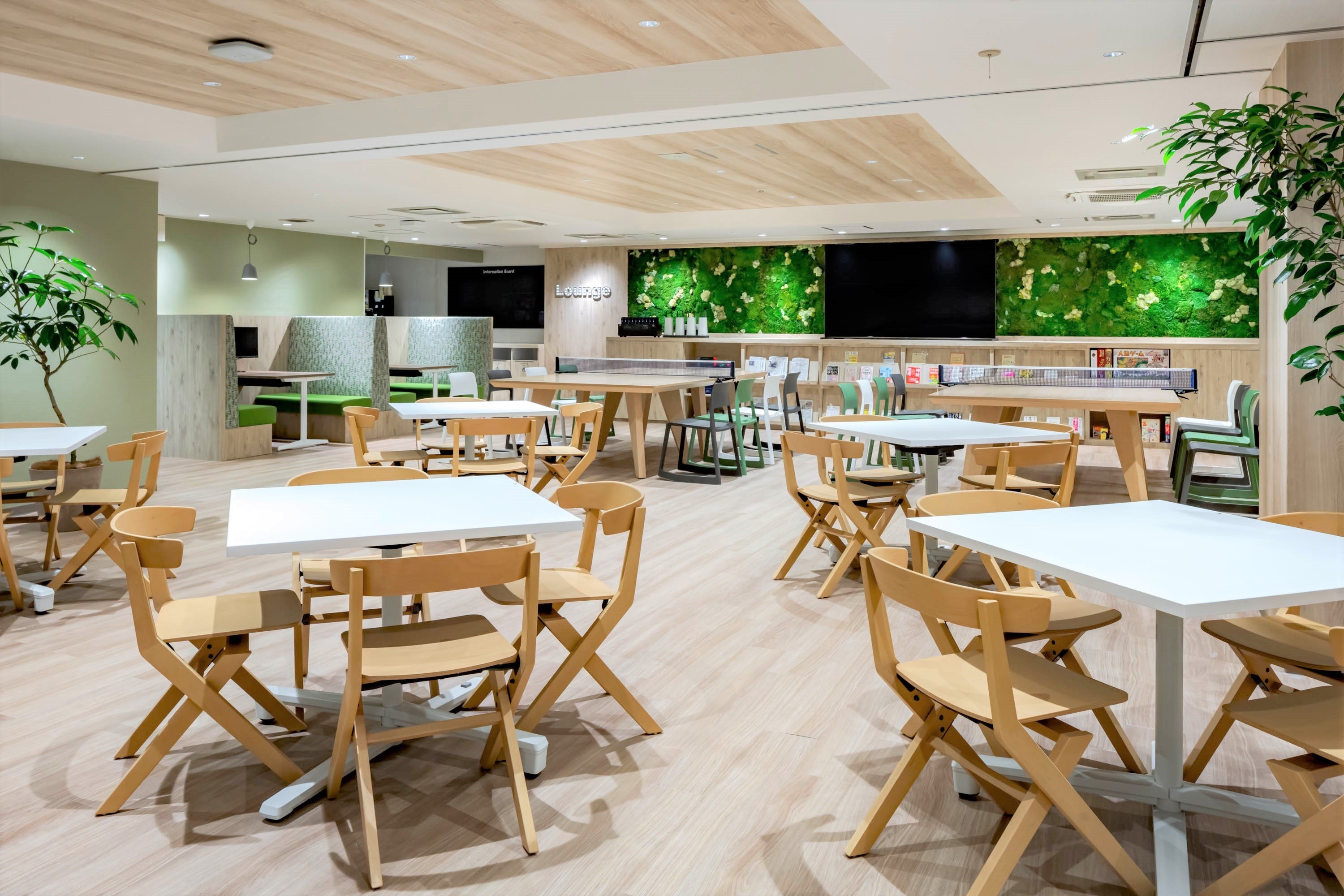 社員アンケートで要望の多かった給茶機・コーヒーサーバー・オフィスコンビニ・ブックラウンジサービスなど、福利厚生設備を導入し、社員の働きやすさの向上にも配慮しました。また、ボードゲームやテレビゲーム、卓球も出来るテーブルなどインフォーマルな社員同士のコミュニケーションを活性化させるツールも取り入れました。