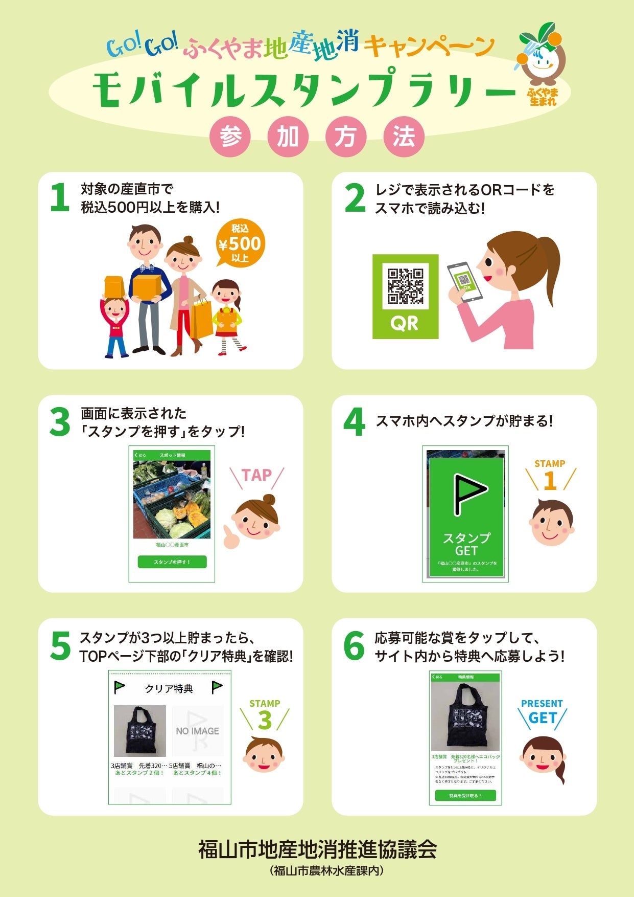 1.福山市内の対象産直市で税込500円以上購入し、レジで提示されるQRコードを読み込んでデジタルスタンプをGET!