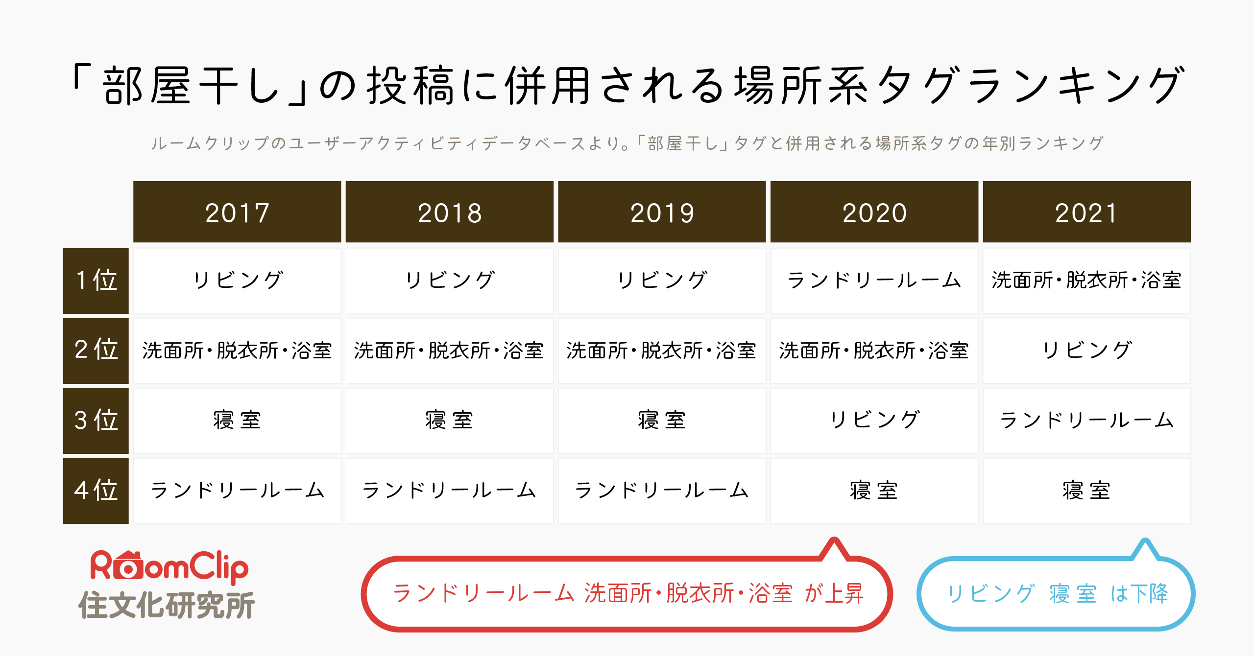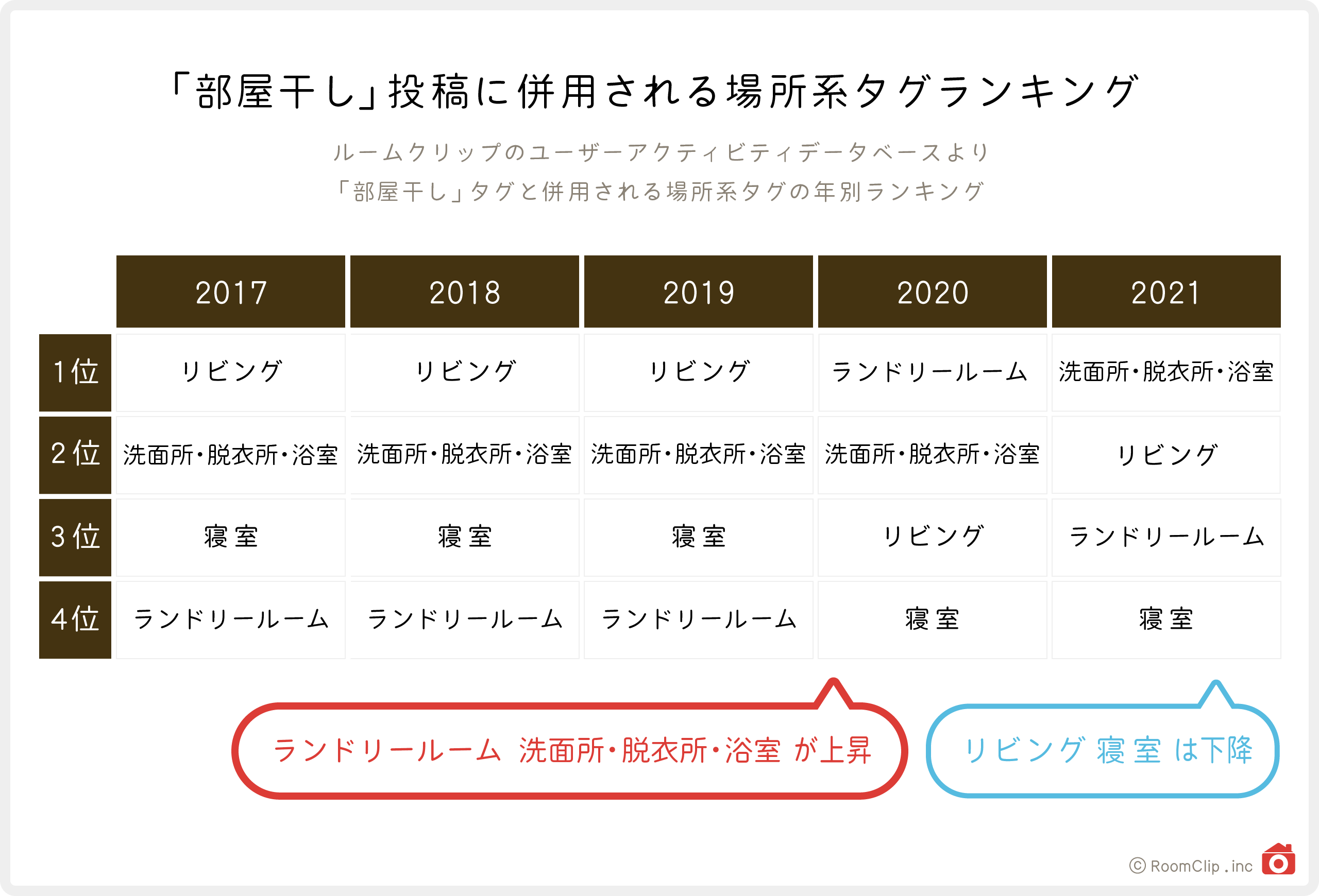 上の表は「部屋干し」というタグと併用される場所系タグの年別ランキングです。