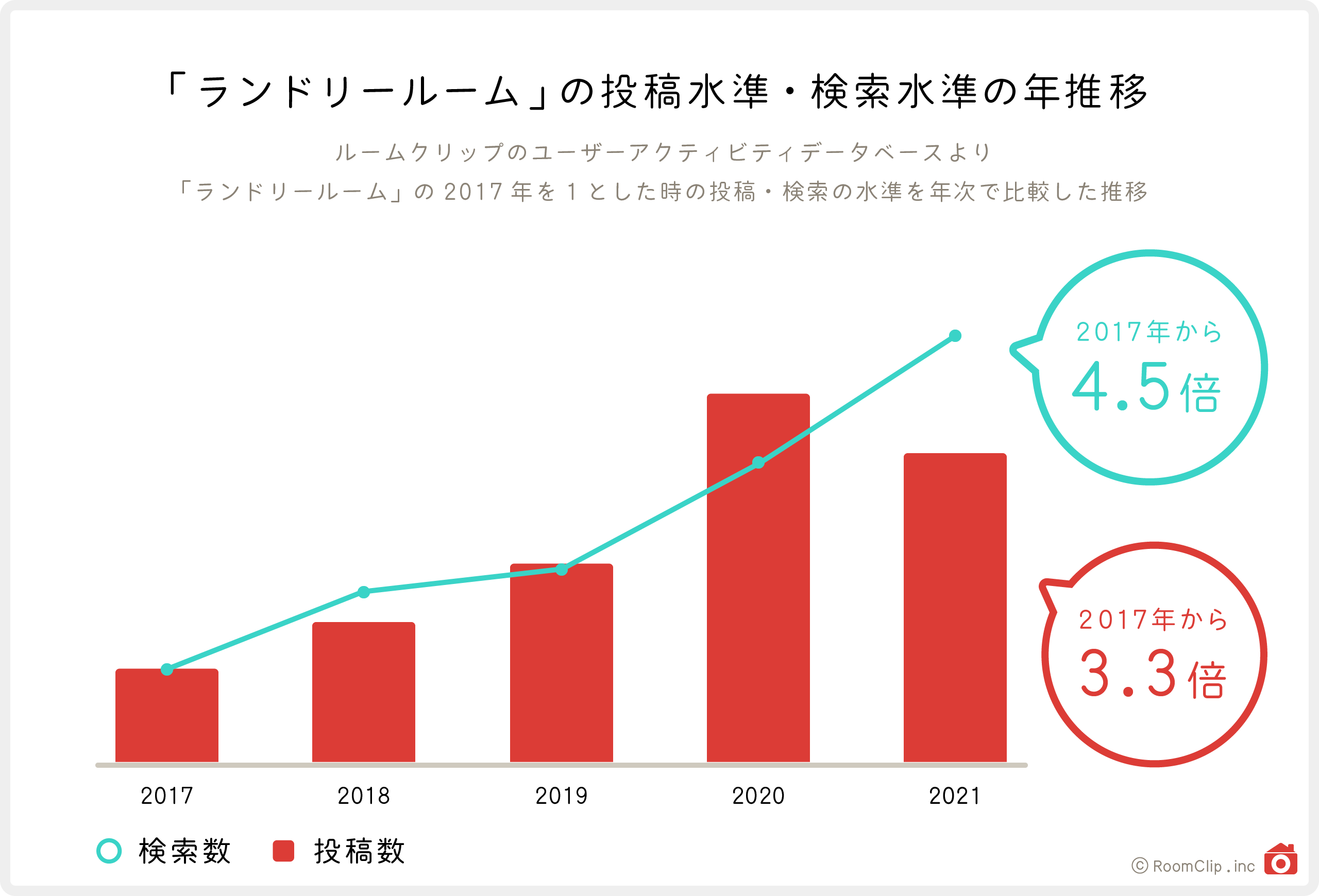 一つ目が、洗濯の全行程を一つの部屋に集約することで導線の最小化を叶える「ランドリールーム」の出現です。英米の住宅では以前より一般的な設備ですが、近年は日本でも注目度が高まっています。RoomClip内のデータを見ても「ランドリールーム」の投稿水準は2017年比で3.3倍、検索水準にいたっては4.5倍も上昇しています。新築やリノベーションなどによる住宅取得層にとって、ランドリールームは定番の間取りになってくることが予想されます。