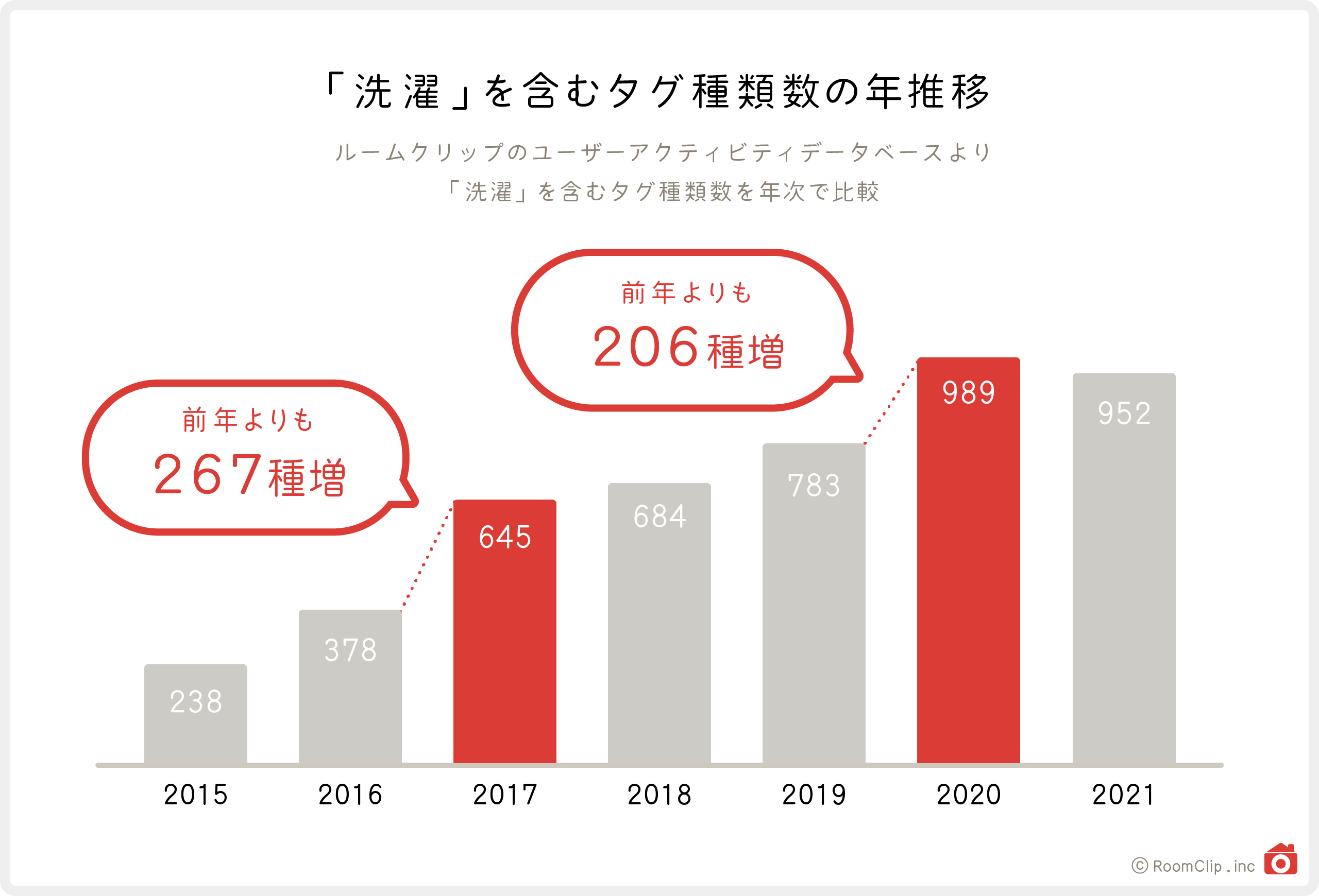 「洗濯」を含むタグの種類が、2017年頃から急増(2017年は前年比267種類増)。RoomClip内において洗濯に関する話題の多様化が進んでいます。