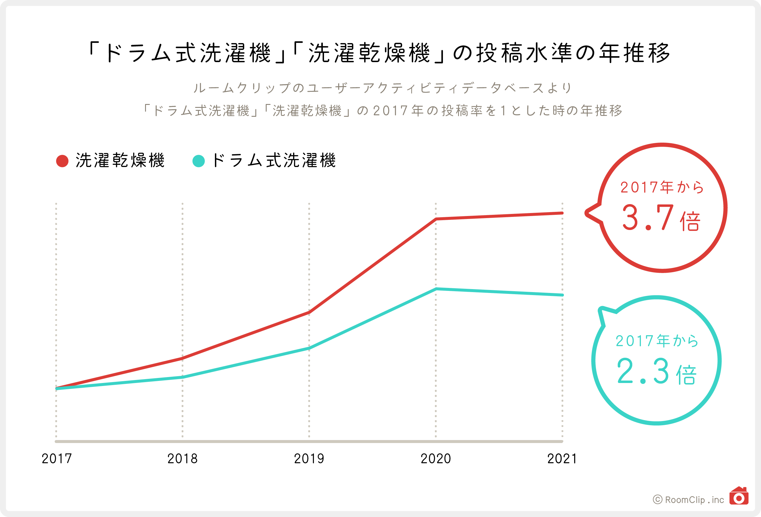「ドラム式洗濯機」の投稿水準は2017年と比べて2.3倍、「洗濯乾燥機」は3.7倍に増加。乾燥機能によって干す量の大幅な縮小が叶うことから、従来の縦型洗濯機と比べ大型でスペースをとり、かつ高価であるにも関わらずドラム式洗濯機が人気を誇っています。