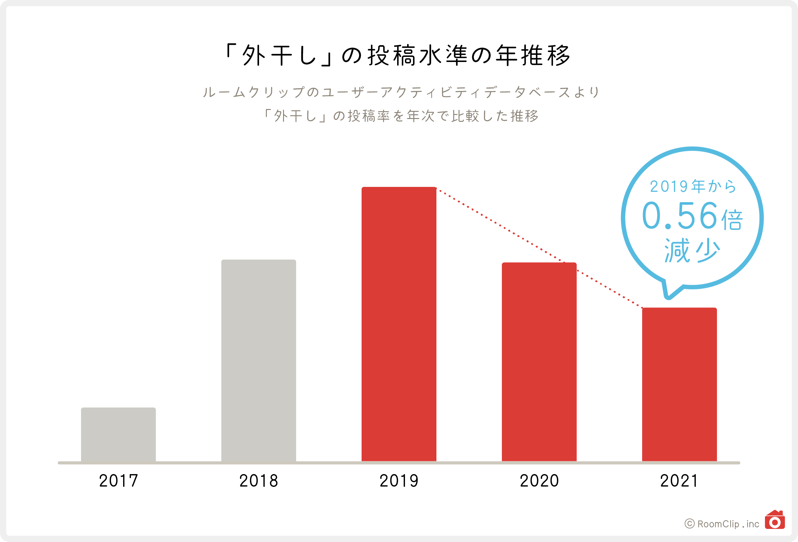 「外干し」の投稿水準は、コロナ前の2019年と比べて2021年は0.56倍と減少。「外干しやめた」ユーザーがいる一方、室内で干しきれない量が出る場合などに一時的な手段として外で干される「ピンポイント外干し」の投稿も。