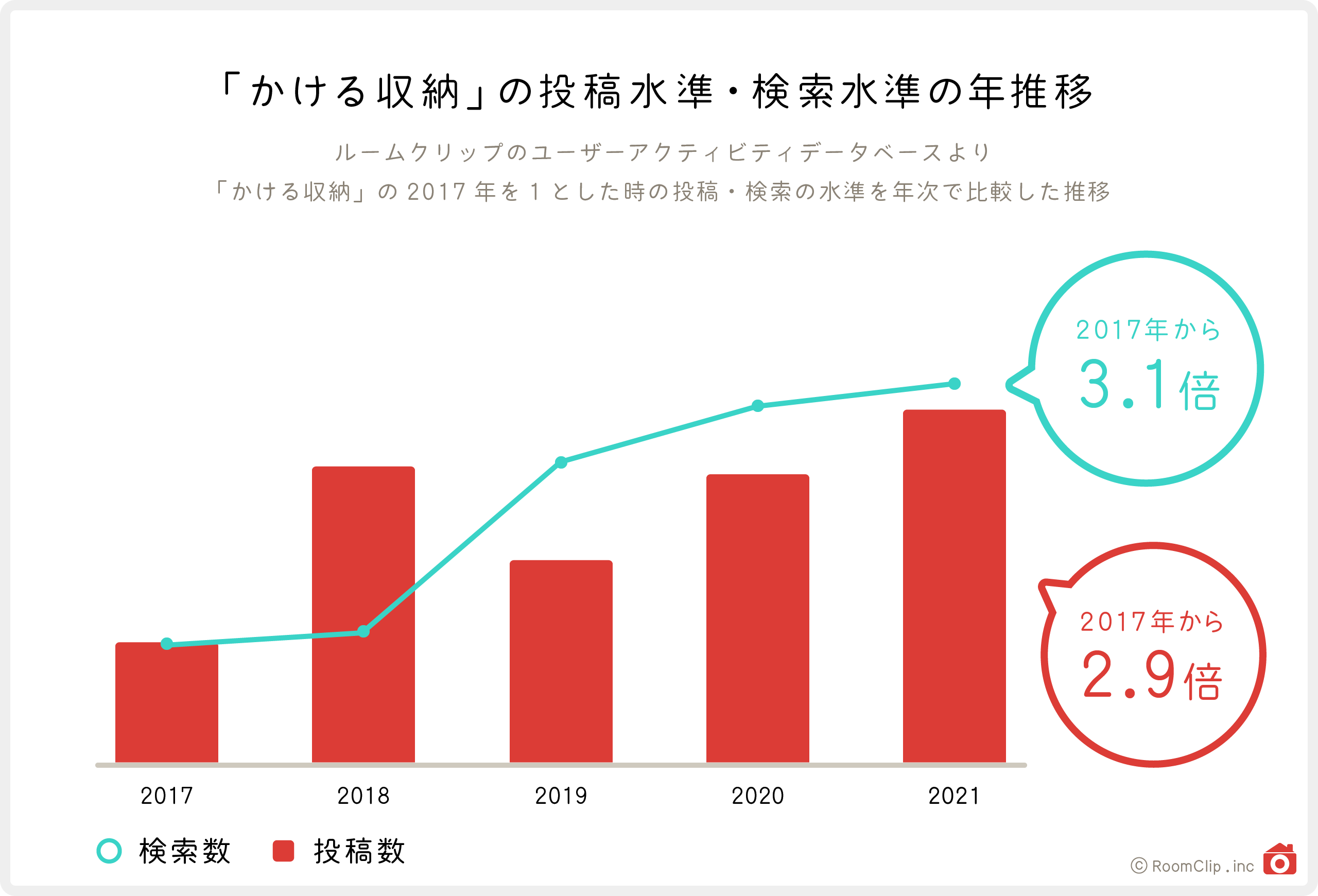 2017年以降、投稿水準・検索水準ともに「かける収納」が増加傾向。2017年と比べて2021年の検索数は3.1倍、投稿水準は2.9倍。