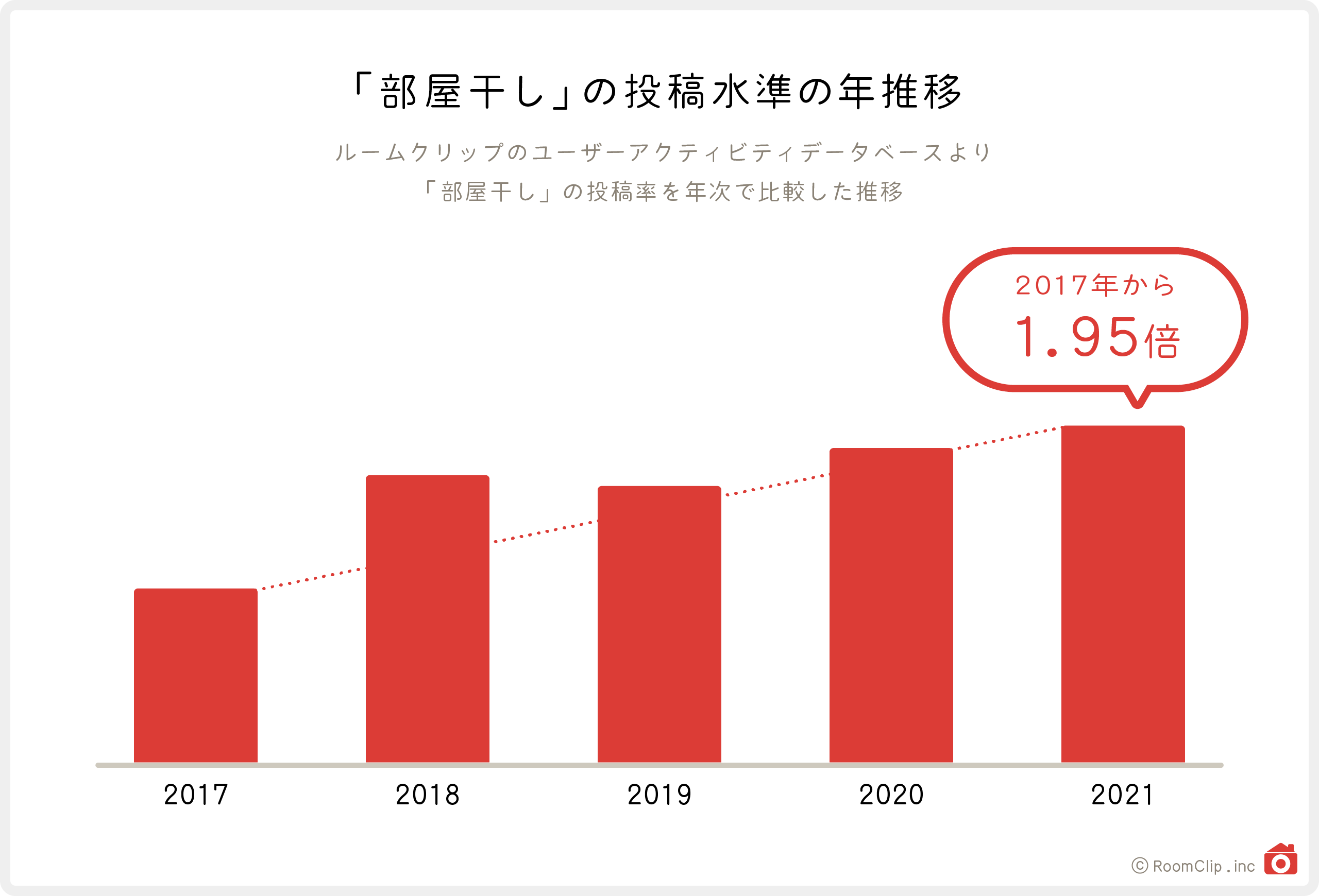 2021年は2017年と比べ「部屋干し」タグの投稿水準は1.95倍に