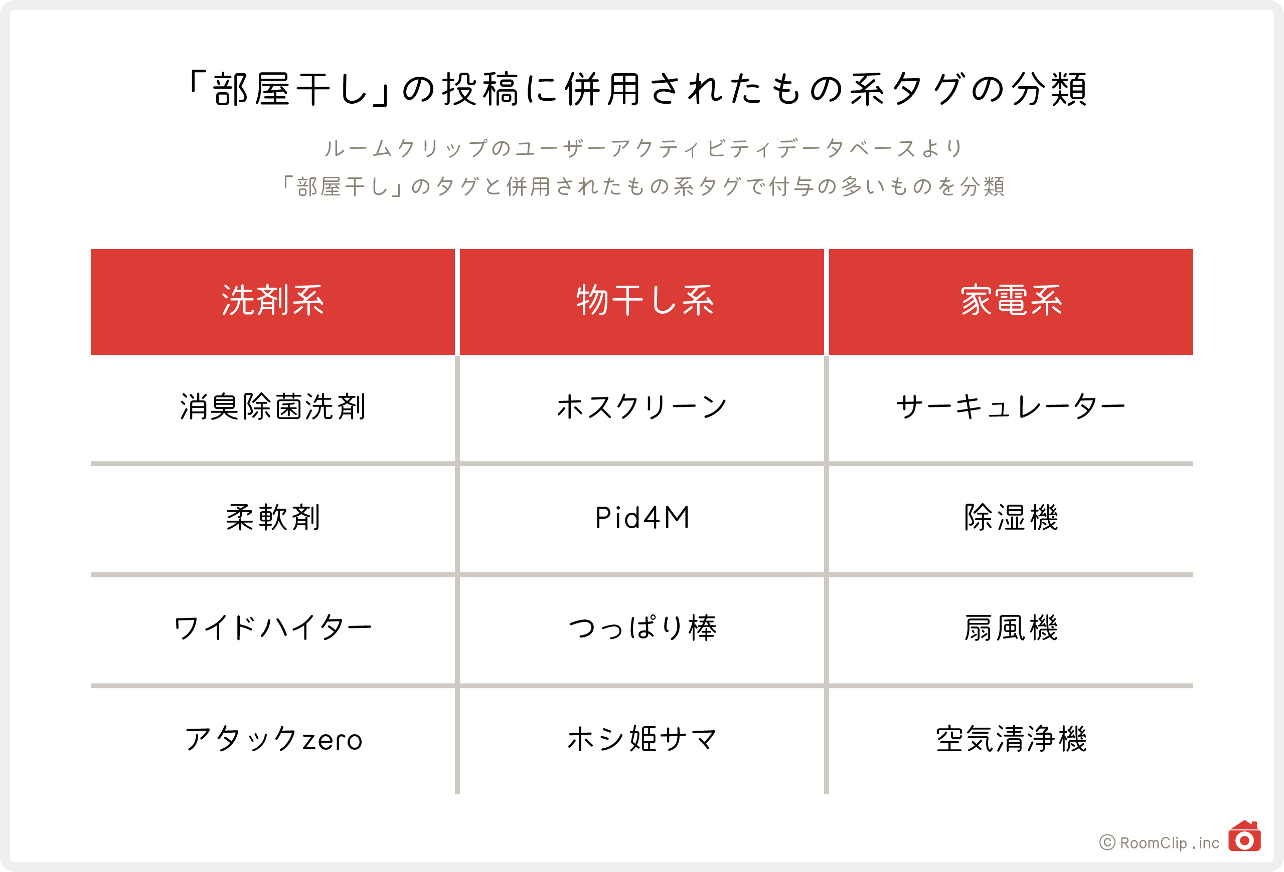 上の表は、部屋干しと併用されるモノ系タグの中から付与が多いものを「洗剤系」「物干し系」「家電系」の3系統に分けて表したもので、それぞれの系統における人気アイテムがわかります。