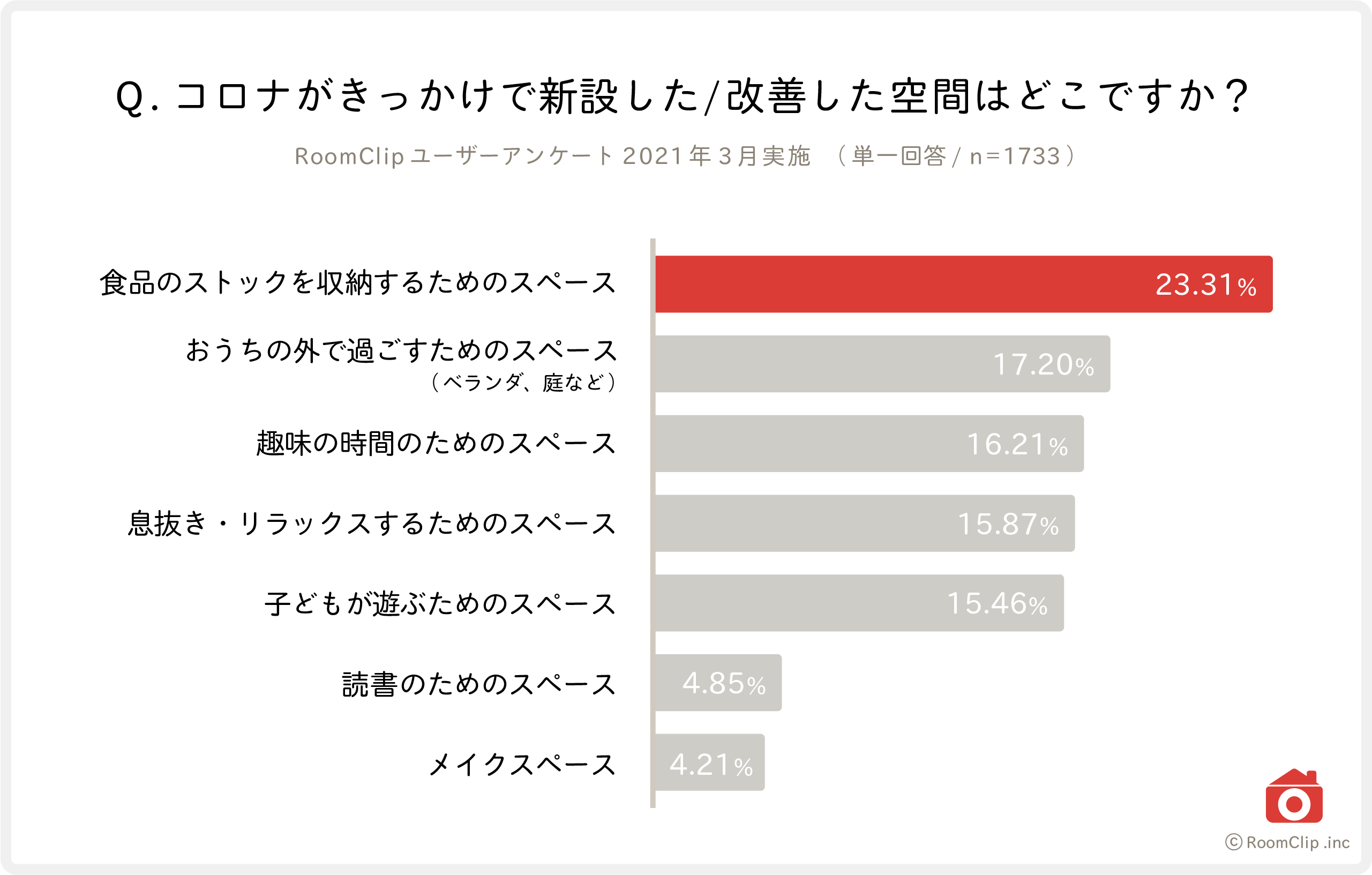 部屋干しの常時化によって、これまで洗濯干し場として使われてきたベランダに空いたスペースが生まれ、新たに憩いの場所として生まれ変わっている。RoomClipがユーザー向けに行った調査でも「コロナがきっかけで新設/改善した空間」として「おうちの外で過ごすためのスペース」が2位にランクイン。