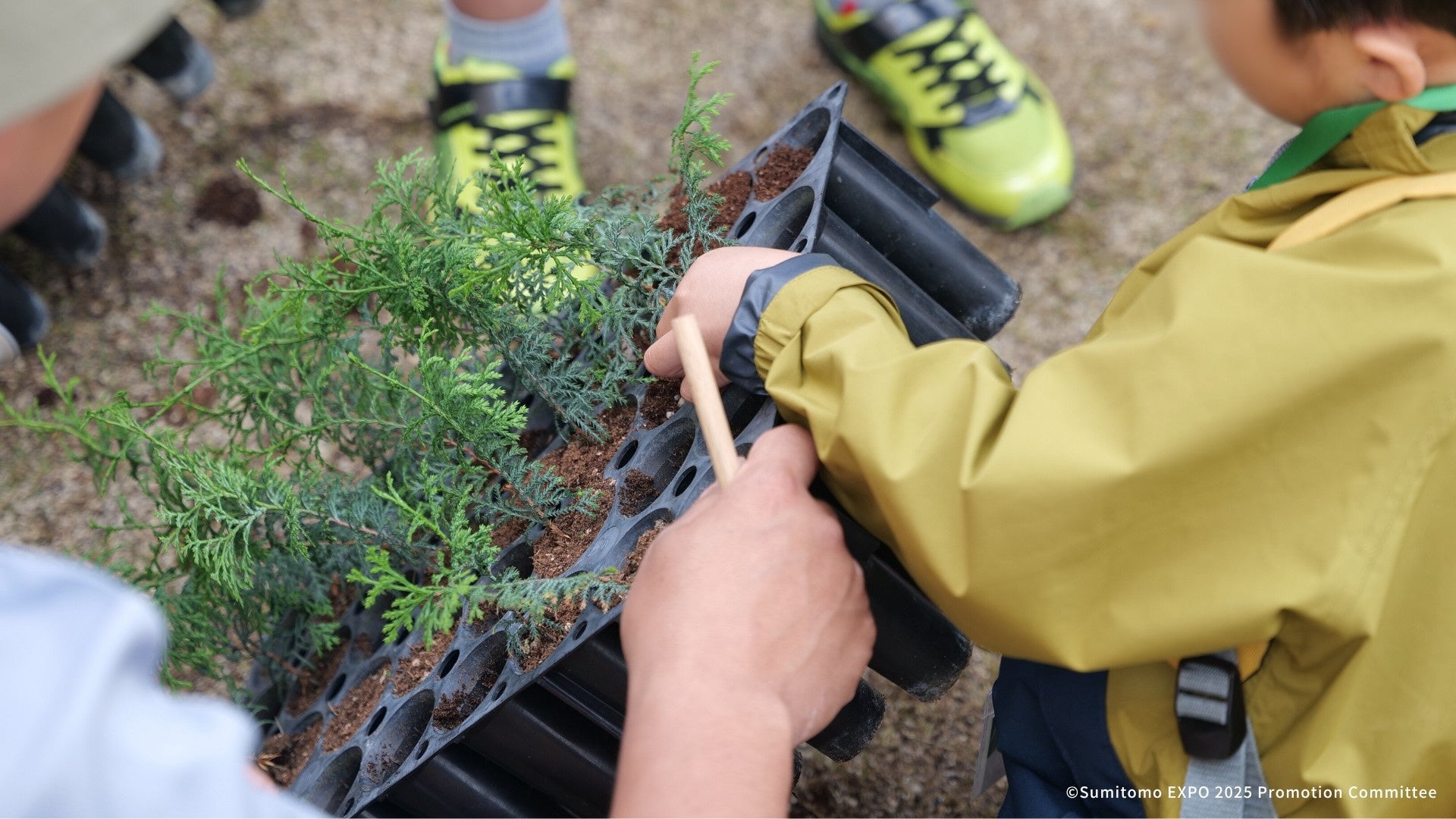 未来の森づくりに参加いただく「植林体験」では、約1万人を超える方々に体験いただきました。ここで植えられた約1万本の苗木は、これから長い年月をかけて育ち、人々の想いと共に未来を支える森「いのちの森」へと成長します。数十年後、数百年後、成長した森のいのちたちが次の世代に出会い、また次の未来へと託されていく。時と共に年輪を重ねるように、今回の住友館の植林体験が、やがて大きな希望の連鎖となっていくことを願っています。