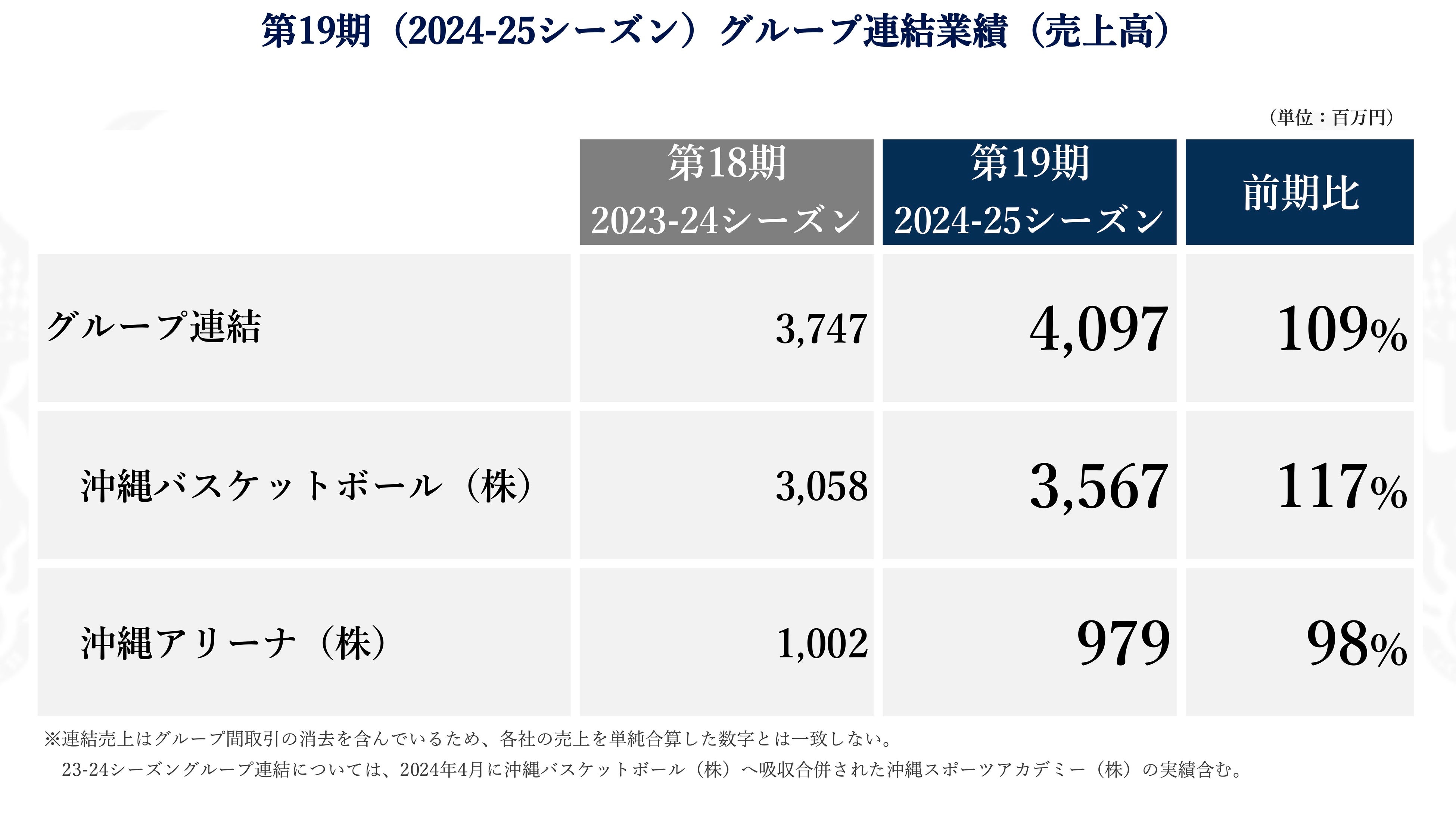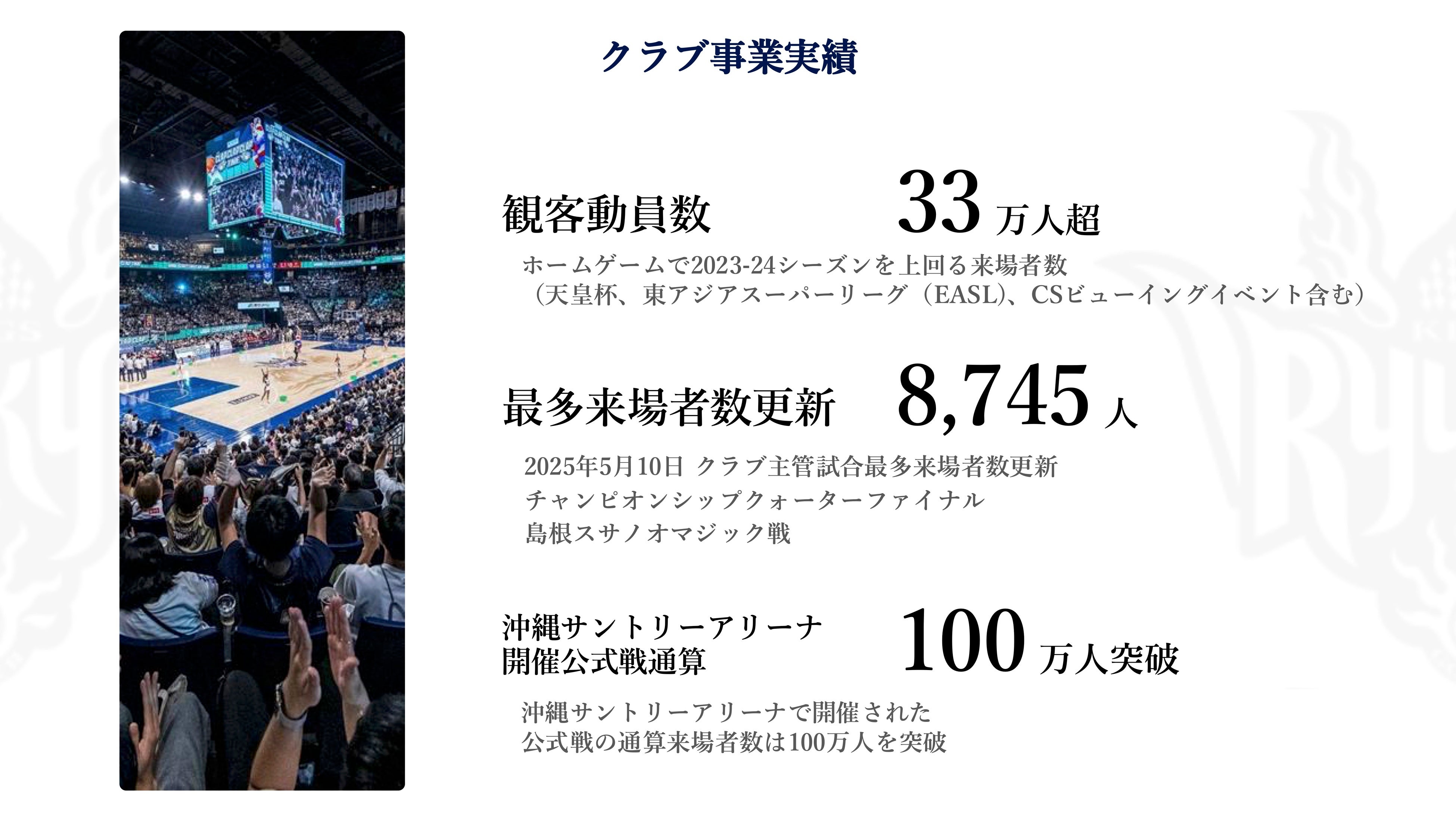 これらの成果は、日頃より多大なる声援をいただくファンの皆さま、そしてご支援いただいておりますパートナー企業をはじめ、ホームタウンである沖縄市、沖縄県バスケットボール協会、メディア、多くのステークホルダーの皆さまのご支援の賜物であると考えております。改めまして、当グループ会社を取り巻く全ての皆さまへ、厚く御礼申し上げます。