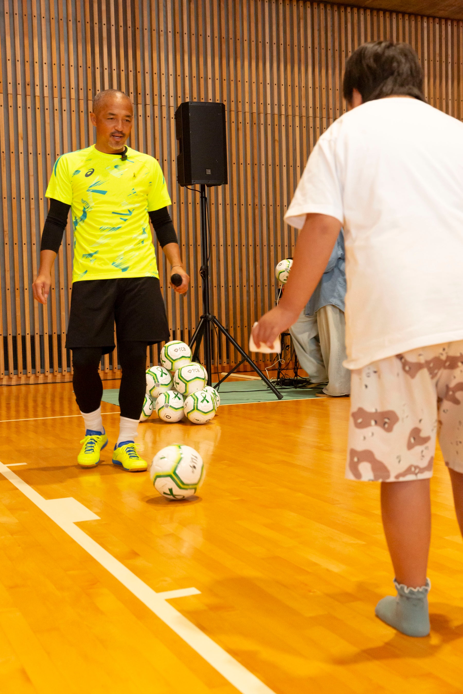 子ども達にグリーンリボン柄がデザインされたサッカーボールを無料配布したのち、リフティングを披露したり、一緒にパス練習をしたりしました。