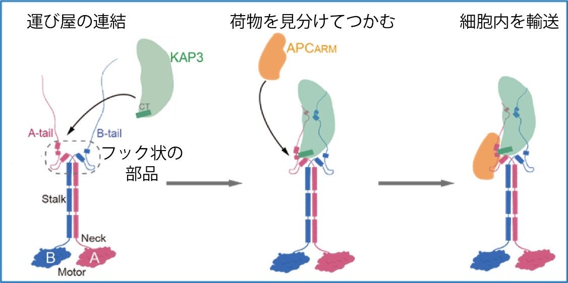 モータータンパク質は、アダプタータンパク質を介して特定の荷物(カーゴ)を認識し、ATPのエネルギーを利用して微小管(注3)のレール上を移動しながら輸送することで、細胞内の多様な機能を実現しています。しかし、カーゴ認識の分子基盤はこれまで十分に解明されていませんでした。本研究では、キネシン‐2の尾部に存在する新規構造モチーフ「HACドメイン(Hook-like Adaptor and Cargo-binding domain)」が、アダプターKAP3およびカーゴAPC(注4)との結合の足場として機能していることを世界で初めて明らかにしました。