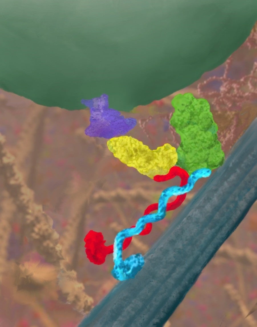 本図は、細胞内の「輸送ハイウェイ」を舞台に、KIF3A(赤)とKIF3B(青)からなるヘテロ二量体モーターが小胞を運ぶ瞬間を描いたものです。KIF3Aの尾部に位置するフック状(HAC)ドメインは、アダプタータンパク質KAP3(緑)を介してAPC(黄)および膜貫通型カーゴタンパク質(紫)と結合し、モーターと貨物をつなぐ橋渡し役を果たします。本研究では、このHACドメインがアダプターとカーゴの両者を認識し結合する「二重の鍵」として機能することを明らかにし、キネシン-2複合体による貨物認識の新たな原理を提示しました。