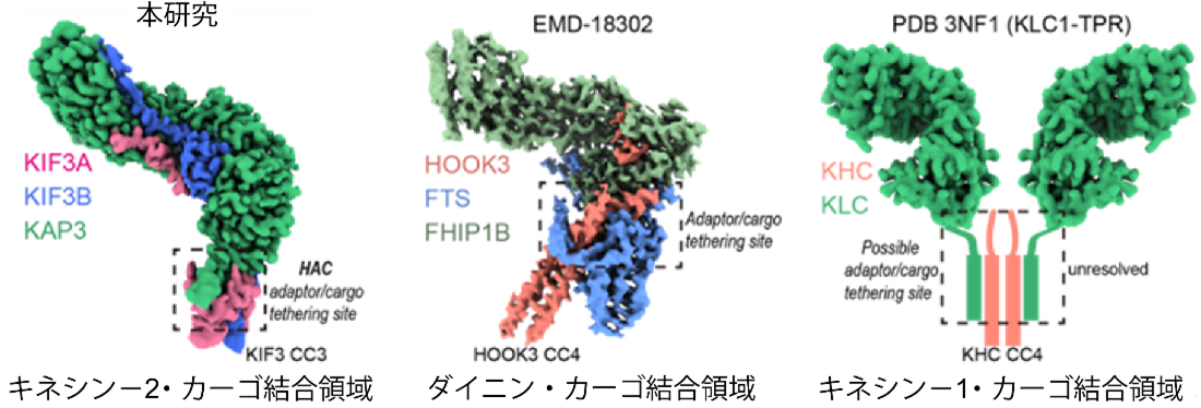 本研究で得られたキネシン‐2・KIF3A/B/KAP3マップと、ダイニンのFTS–HOOK–FHIP1B (FTF) カーゴ結合アダプター複合体マップ、およびキネシン-1 KHC/KLC予測モデルとの比較。FTFのマップは(EMDB: EMD-18302)から得られており、KLC1 TPRドメインのマップは、その結晶構造(PDB: 3NF1)に基づいて生成されています。
