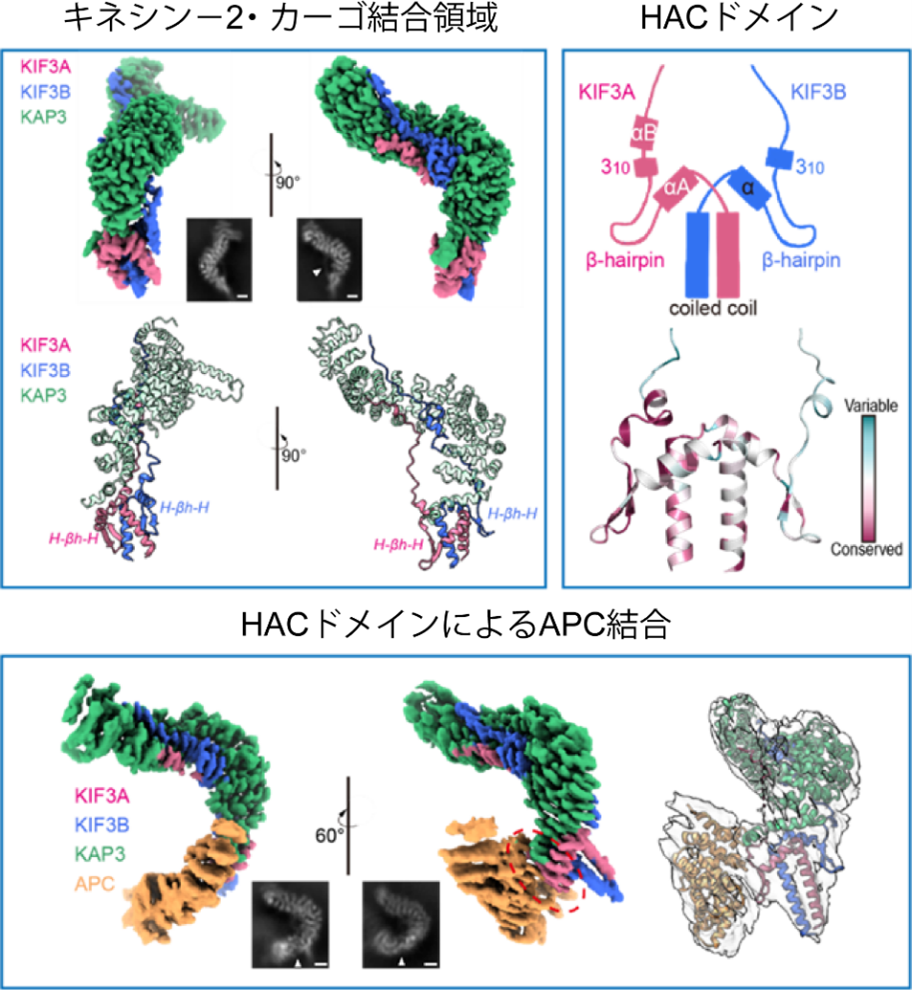 (左上パネル) KIF3A/B/KAP3尾部複合体のクライオ電子顕微鏡マップと構造。挿入図には代表的な2D平均像を示し、白矢印はKIF3Aリンキングループを指しています。複合体はKIF3コイルドコイルの軸部、H-βh-H(HAC)モチーフ、伸長したテイルループ、KAP3から構成されています。
