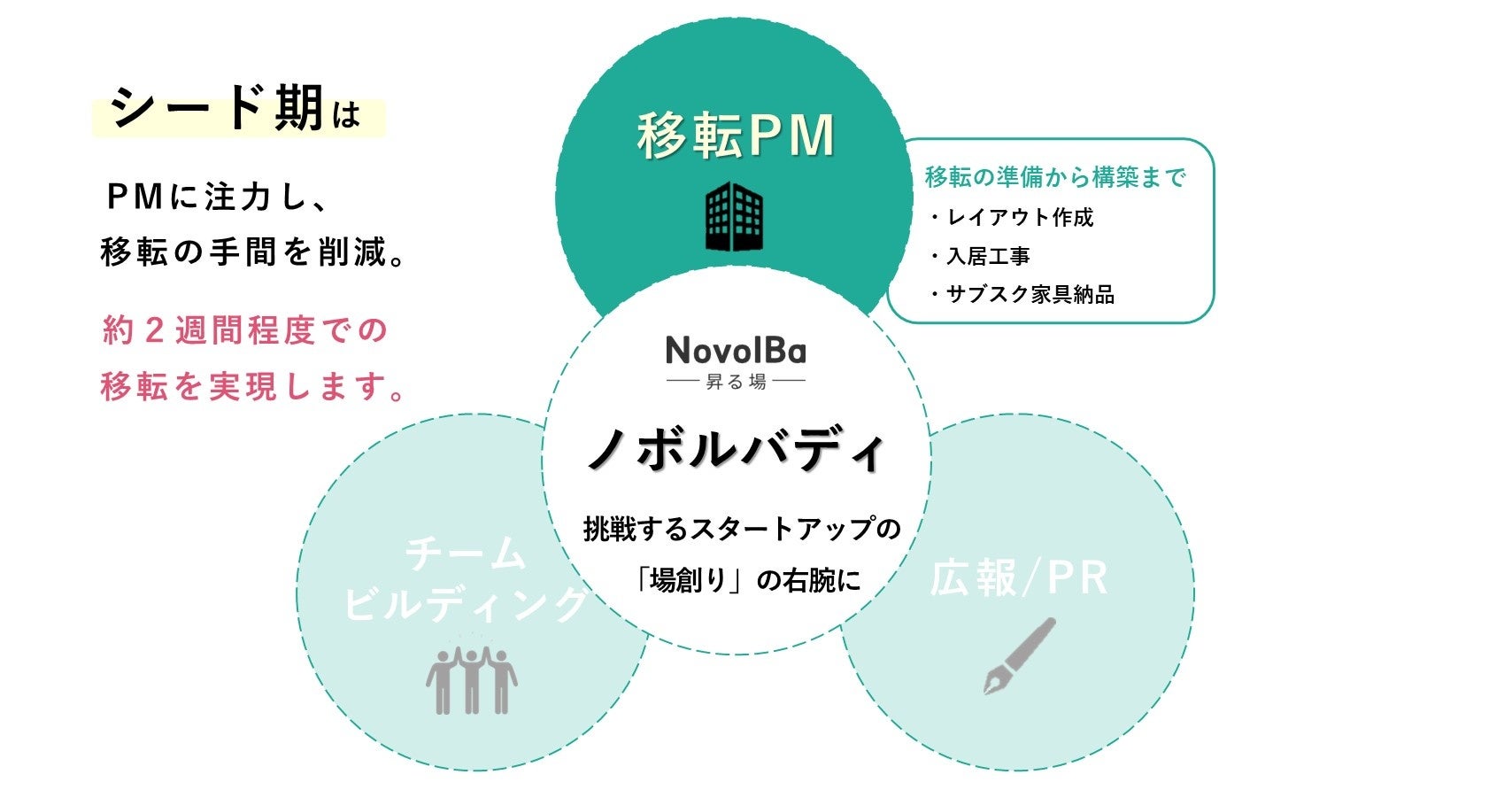 スタートアップがオフィスを構築する際に発生する、要件整理からレイアウト設計、工事から入居までの様々な折衝と調整業務を、NovolBaがワンストップで行います。スタートアップのステージに合わせて、シード期向けには最短2週間で移転可能なサービスを、アーリー期以降には戦略的なオフィス計画を策定し、最低限のコストで構築するサービスを提供します。