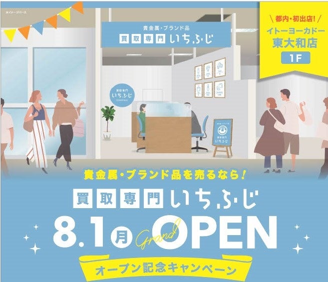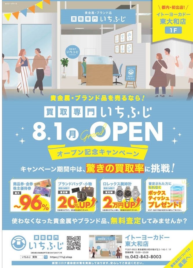 「買取専門 いちふじ」は、静岡県・神奈川県・愛知県を中心に出店していますが、今回東京都に初出店のイトーヨーカドー東大和店は、地元の皆様から愛されているショッピングスポットです。「買取専門 いちふじ 」は初めてでも安心して気軽に立ち寄れる買取店がコンセプトで清潔感のあるデザインの店舗となっています。