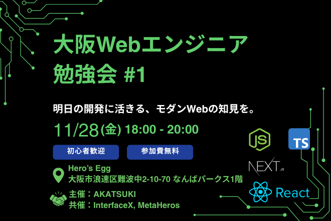 株式会社Meta Heroes(本社所在地:大阪府大阪市、代表取締役:松石和俊、以下「当社」)は、当社が運営するDX教育施設「Hero Egg」にて、「大阪Webエンジニア勉強会 #1 〜明日の開発に活きる、モダンWebの知見を。〜」を、株式会社AKATSUKI、InterfaceX株式会社と共同で開催いたします。