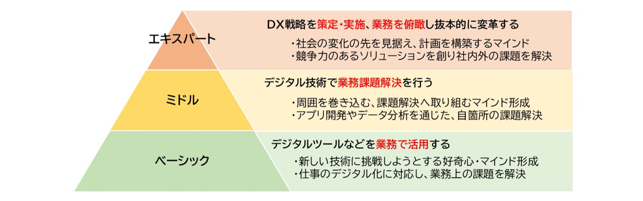 2027年度末までに、デジタル技術で業務課題解決を行う「ミドル」人材約5000人の育成に向けて、デジタル推進人材(社内呼称は「DXプロ」)がデジタル人材の育成に取り組んでいます。今後も職場DX推進に向けてデジタル人材の育成に努めています。