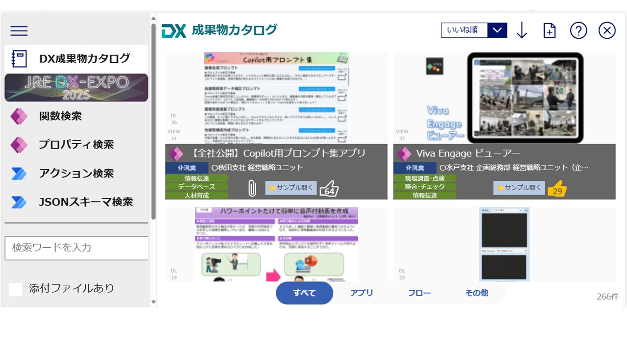 社内DXの成果物を一元管理するアプリ。全社員が一覧可能で他職場の業務課題改善事例を共有することで同様の業務課題を抱える職場にとって有効な解決策としても活用している。