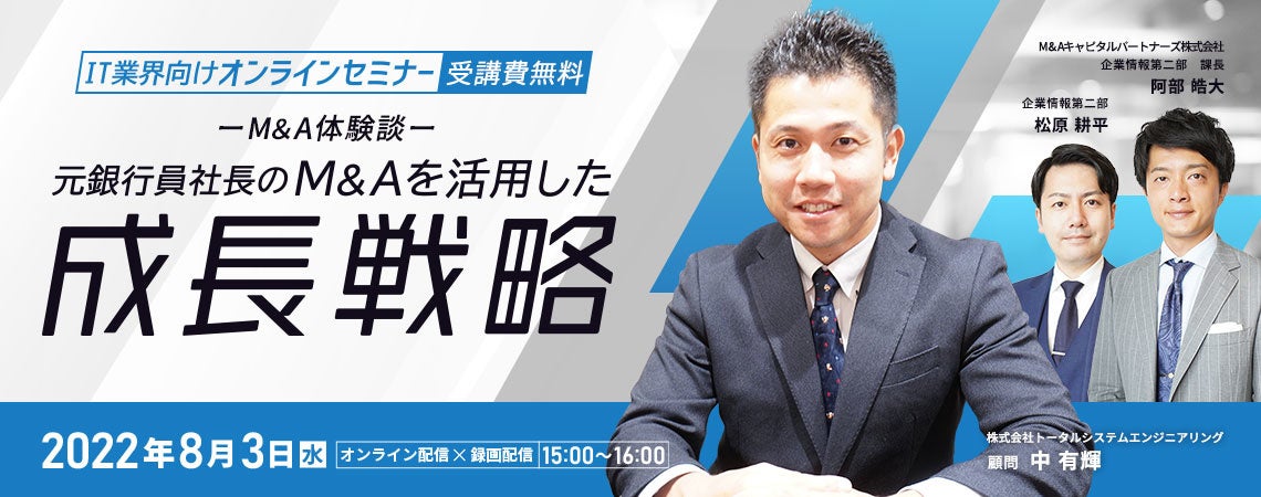 業歴30年以上・実質無借金経営・高収益体制を続けてきた株式会社トータルシステムエンジニアリング。株式会社トータルシステムエンジニアリングのメインバンクとして当時、銀行に勤めていた中様が、なぜ銀行員から取引先企業の社長に転身したのか?転身後に、創業者と共にM&Aを検討した際の心境やM&Aで会社を譲渡した現在の状況についてお話いただきます。