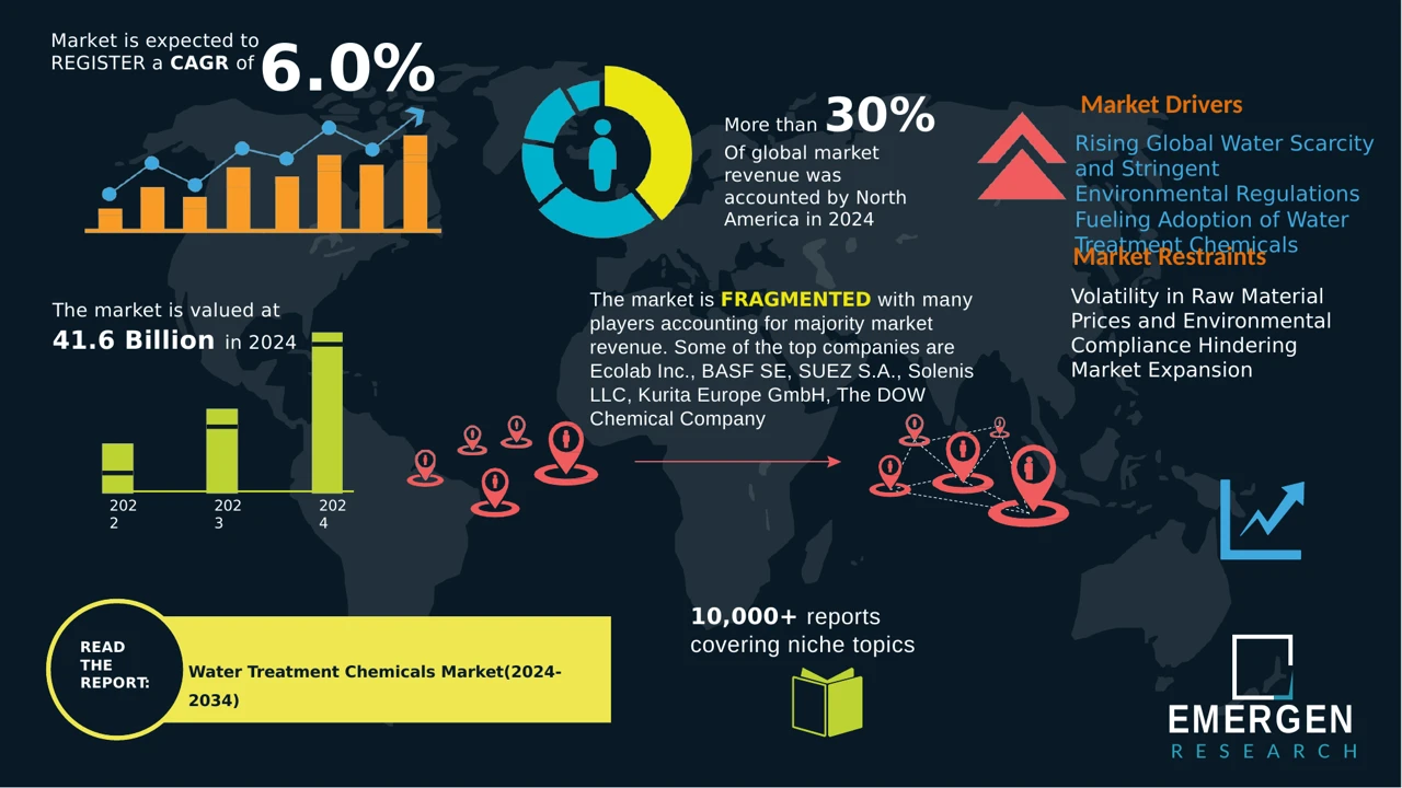 自治体が水インフラ戦略を成熟させ、産業施設が持続可能性への取り組みを進めるにつれて、市場はパイロットプロジェクトから企業全体への導入へと移行し、2034年まで成長が加速すると予想されます。規制圧力、水不足への意識、技術革新、そして持続可能な化学品の開発が融合することで、組織が高度な水処理ソリューションを世界規模で開発、導入、そして拡大するための前例のない機会が生まれています。