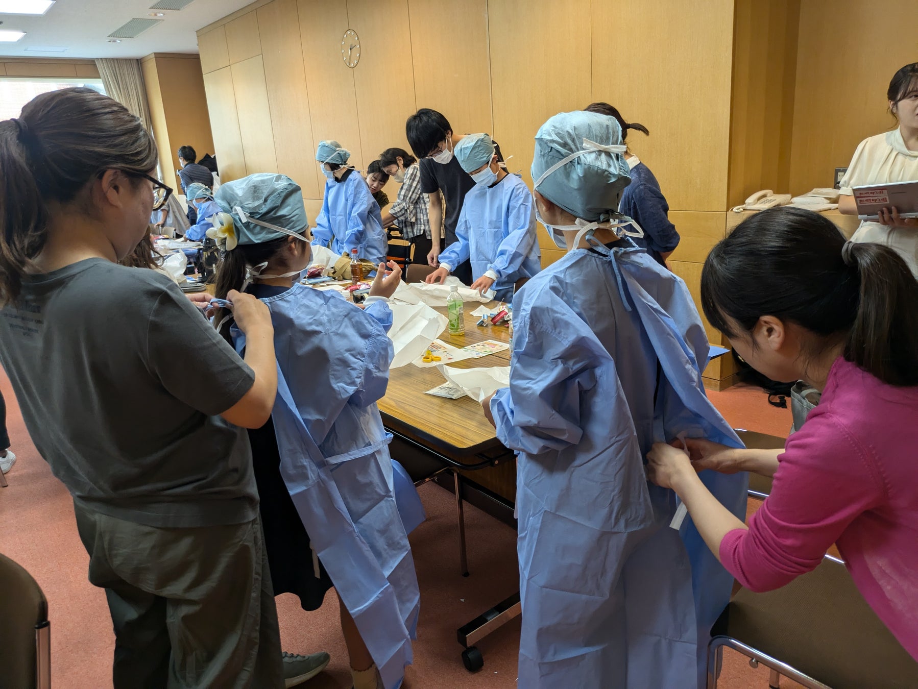 子どもたちは手術用の滅菌ガウンや手袋を着用し、本物さながらの医療現場を体験しました。 -