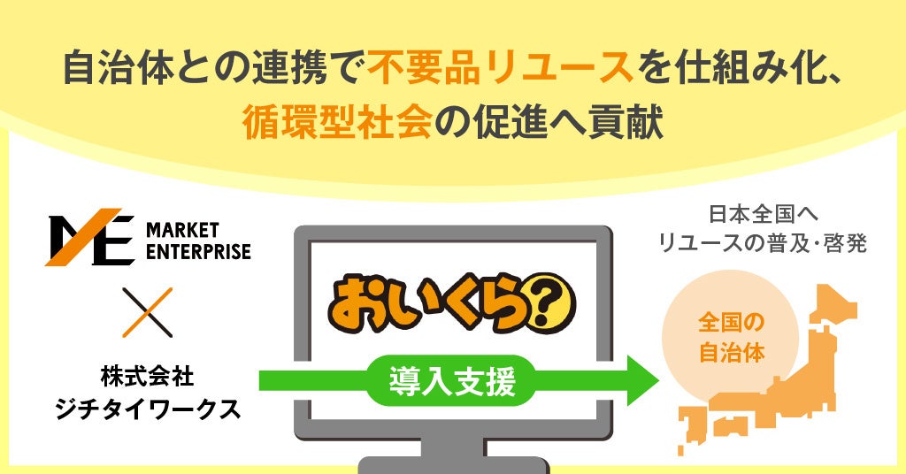 官民連携・自治体同士の連携の促進を目的とする媒体発行・プロモーション支援事業等を行う株式会社ジチタイワークス(本社:福岡県福岡市、代表取締役社長:時津孝康、以下「ジチタイワークス」)は、株式会社マーケットエンタープライズ(本社:東京都中央区、代表取締役社長:小林泰士、東証プライム上場:3135、以下「マーケットエンタープライズ」)が運営する日本最大級のリユースプラットフォーム「おいくら」の自治体導入支援を2022年7月より開始いたしましたので、お知らせいたします。
