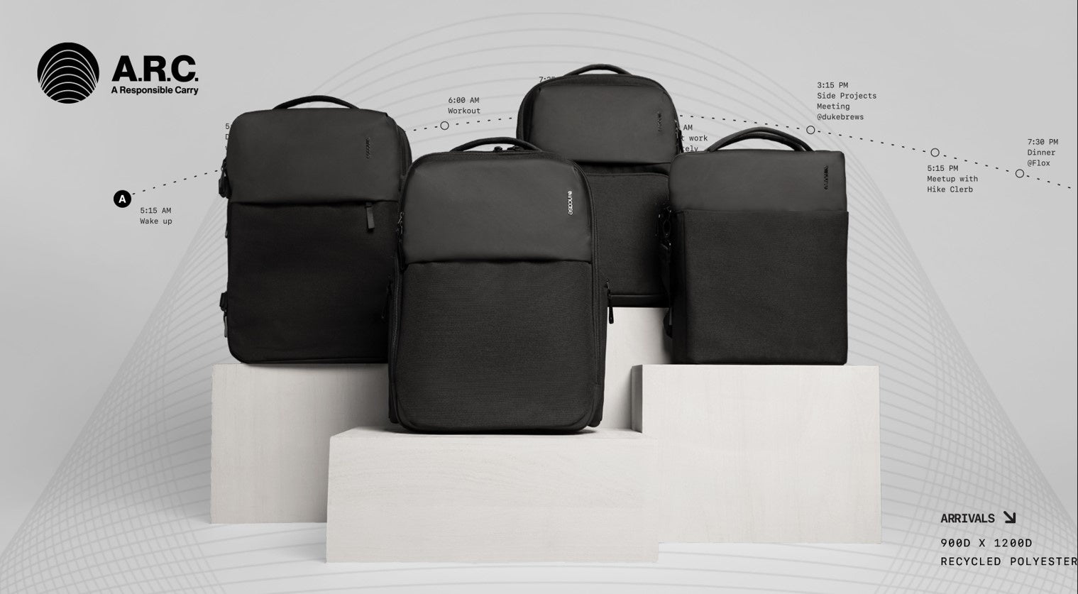 撥水加工を施したリサイクル素材と多様なギミックにシンプルな美しいデザインが特徴の「A.R.C.コレクション」