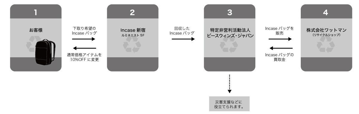 このプロジェクトは、Incaseの不要になったバッグをブランドが積極的に回収やリユースすることで災害支援や製品のライフサイクルを最適化する試みです。リユースや災害への支援は特定非営利活動法人ピースウィンズ・ジャパンの協力を通して推進していきます(※詳しいプロジェクトの工程は次頁の図1をご参照ください)。寄付にご協力をいただきましたお客様は返礼としてIncaseのすべてのアイテムを1会計につき10%割引きにて購入可能となります。