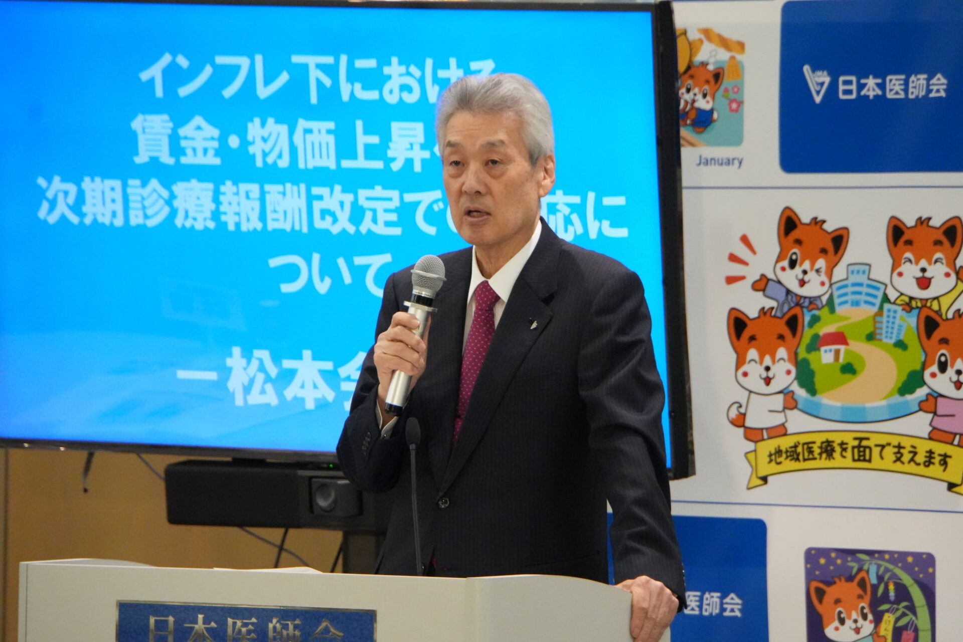 当日の会見テーマは、(1)インフレ下における賃金・物価上昇への次期診療報酬改定での対応について(2)国宝「医心方」のユネスコ「世界の記憶」登録に向けた仁和寺への視察について(3)「令和7年度医師の働き方改革と地域医療への影響に関する日本医師会調査結果」について(4)「地域に根ざした医師会活動プロジェクト 第5回シンポジウム」の開催についての4つでした。