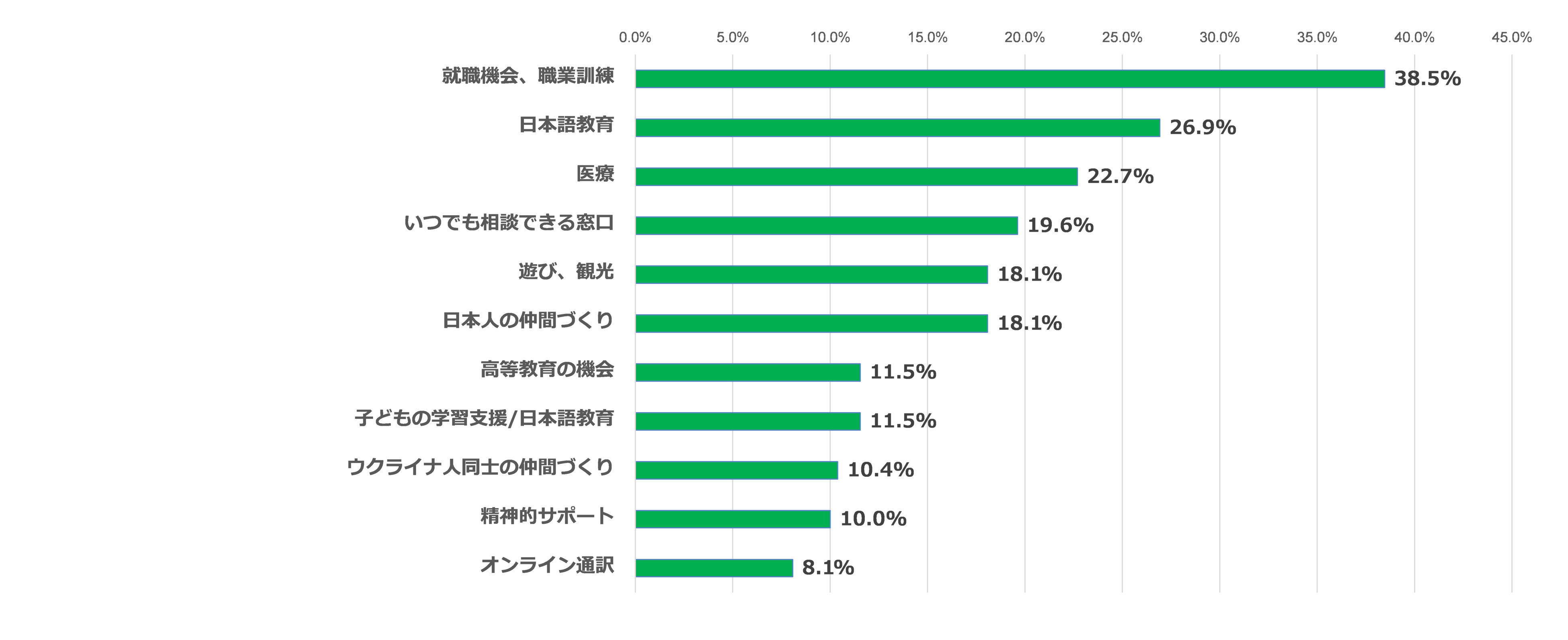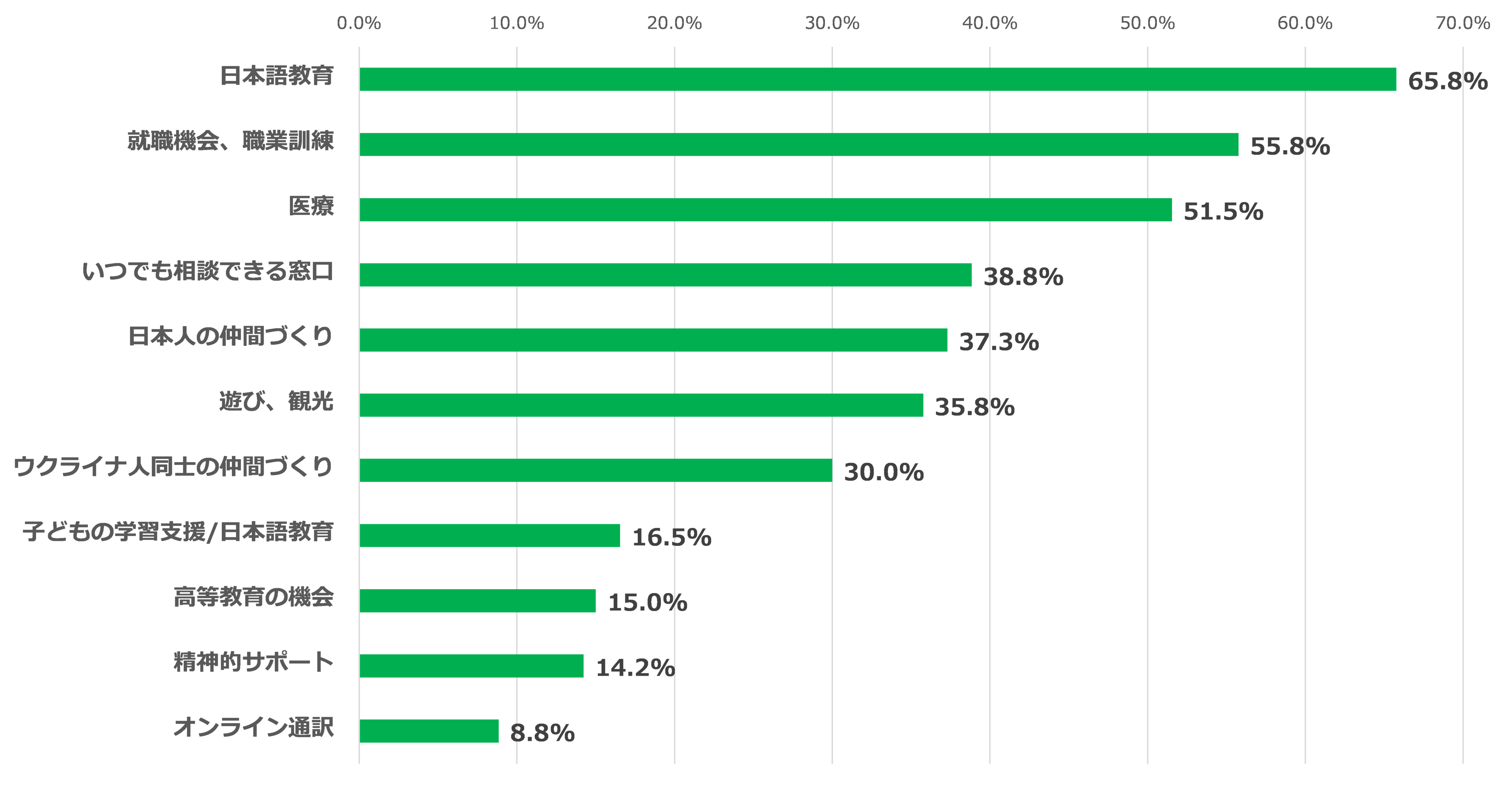 また、日本財団へ渡航費や生活費の申請を行った避難民を対象にアンケート調査を行った結果、65.1%の避難民が引き続き日本滞在を希望しています。必要なニーズとしては「日本語教育」が65.8%で最も多くなりました。また、26.9%が「眠れないことがある」「孤独を感じる」と回答するなど精神面でのサポートの必要性を示唆しています。