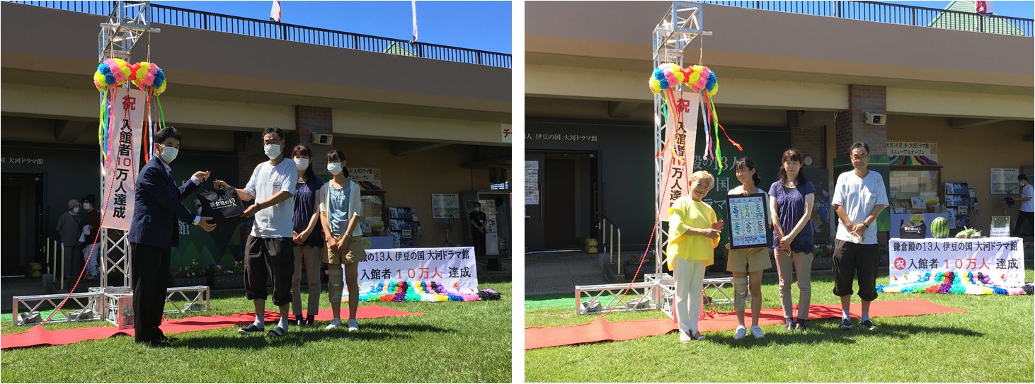 10万人目に入館されたお客様に、大河ドラマ「鎌倉殿の13人」伊豆の国市推進協議会会長から記念品を贈呈しました。