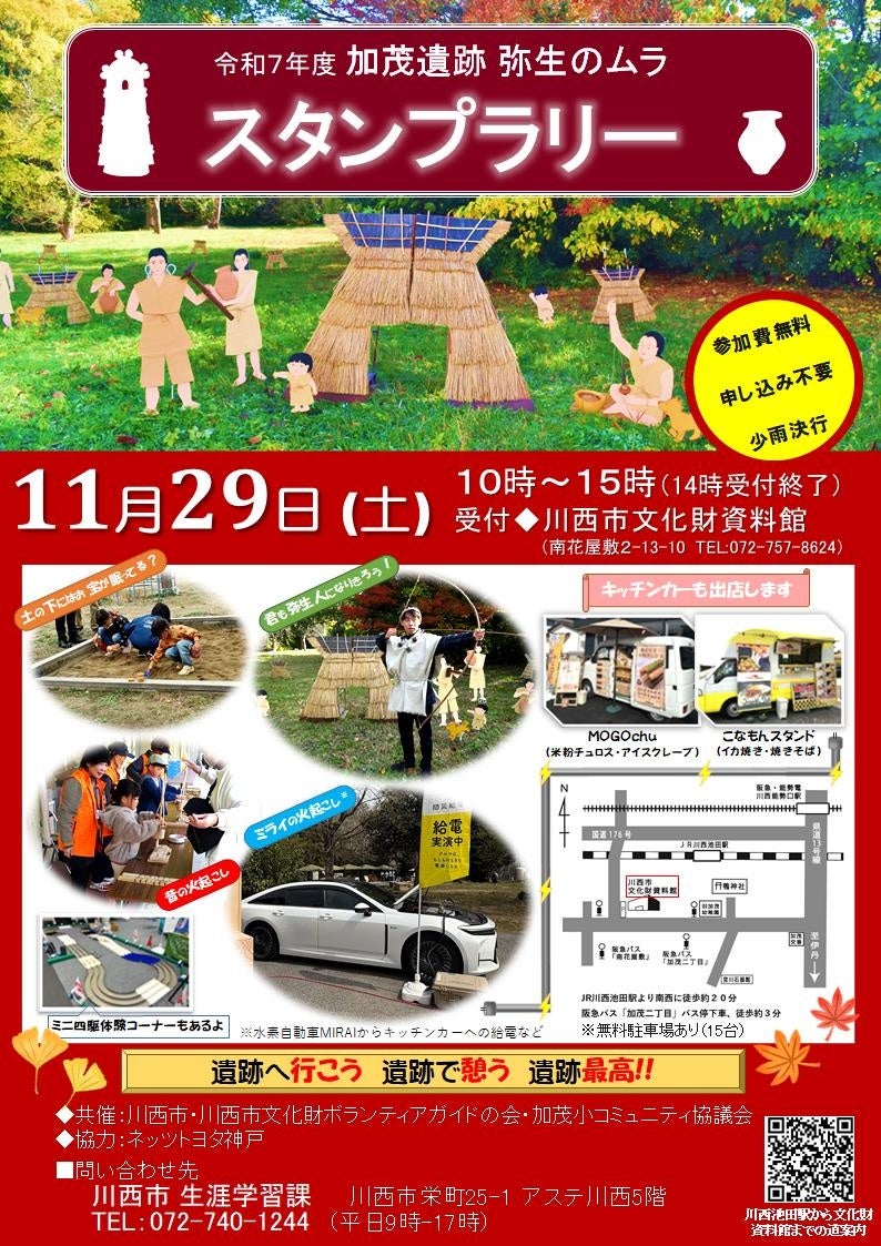 兵庫県川西市では、今から2000年前の弥生時代中期に近畿地方を代表する大規模集落として発展し国の史跡に指定されている加茂遺跡の特徴的な場所や、遺跡と関わりの深い鴨神社、宮川石器館などをめぐるスタンプラリーを開催します。