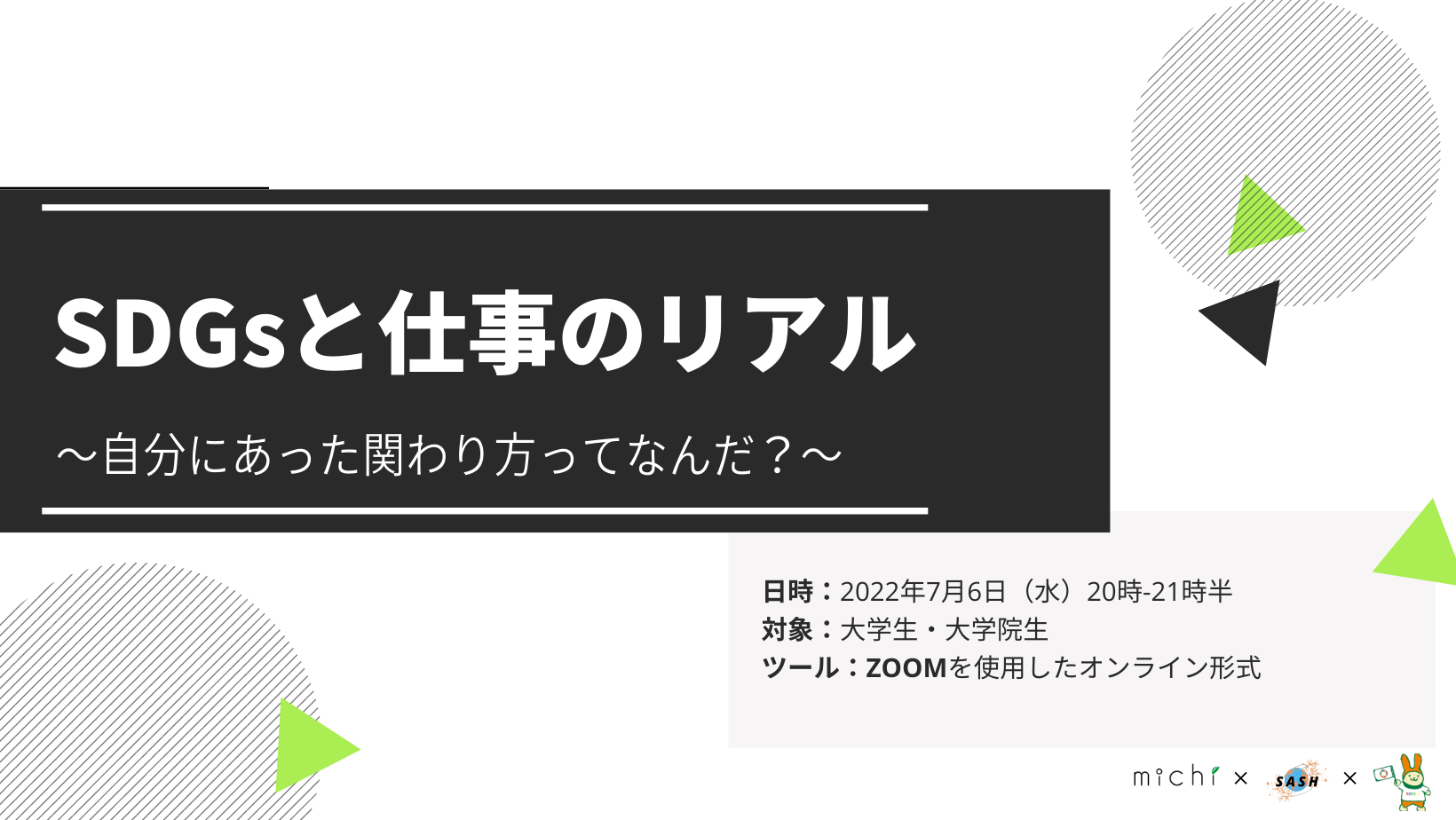 今回のセミナーでは、仕事を通してSDGsにどのような関わり方ができるんだろう?と考えている学生に向けて、SDGsに関連性の高い仕事に取り組まれているゲストをお呼びし、様々なキャリアの選択肢や、仕事の「リアル」を学べる場を企画いたしました。