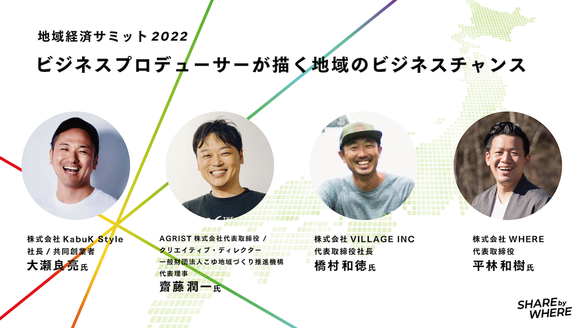 ◉登壇者:大瀬良 亮 氏(株式会社KabuK Style 社長)、齋藤 潤一 氏(AGRIST株式会社 代表取締役)、橋村 和徳 氏(株式会社VILLAGE INC 代表取締役社長)、平林 和樹 氏(株式会社WHERE 代表取締役)