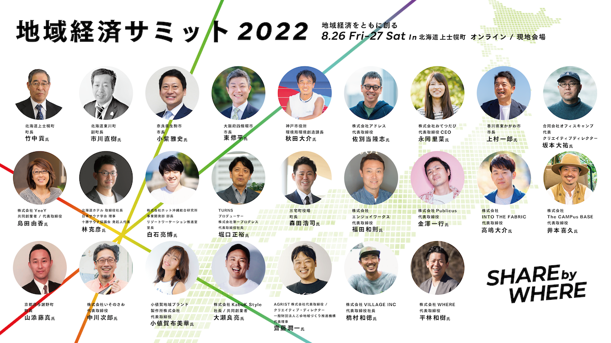 「SHARE by WHERE」概要日本全国から産学官の枠を超えた、各自治体の首長や起業家が、開催地(北海道上士幌町)に集結し、地域のリアルな課題を取り扱うトークセッションを8テーマで開催します。