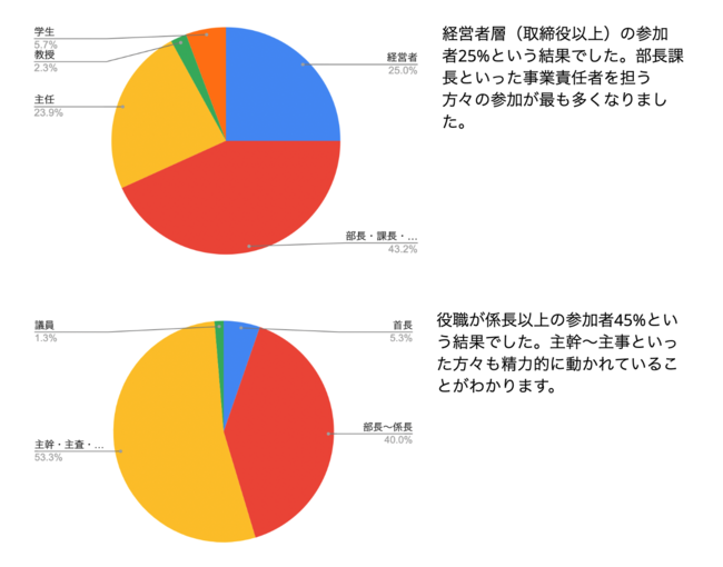 参加者は民間企業が6.5割、行政が3.5割のうち、民間企業は経営者層(取締役以上)の参加者25%、行政は係長以上の役職の参加者が45%と、全体として事業責任者以上の、決済権を担う方の参加が高く、イベント開催時のみの盛り上がりで終わるのではなく、その後の継続的な繋がりやプロジェクト連携が行われていることが大きな特徴です。