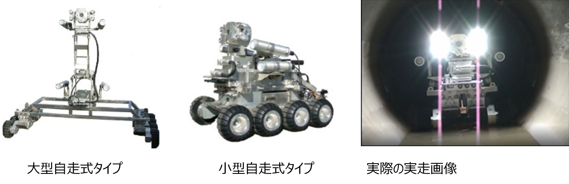 管径800mmから4000mmの大・中口径管内を調査できる自走式テレビカメラシステムです。2000mのケーブルを搭載しており、従来、対応が難しかった長距離管路にも対応可能です。カメラはズームアップ機能や、4点レーザー光によるクラック等の幅や長さの計測機能、酸素、硫化水素濃度を計測できるセンサーの搭載により、管路内の異状箇所の他、環境調査も可能です。8輪独立駆動の自走車は自由に転回可能で、曲がり管や土砂の堆積等に柔軟に対応できます。